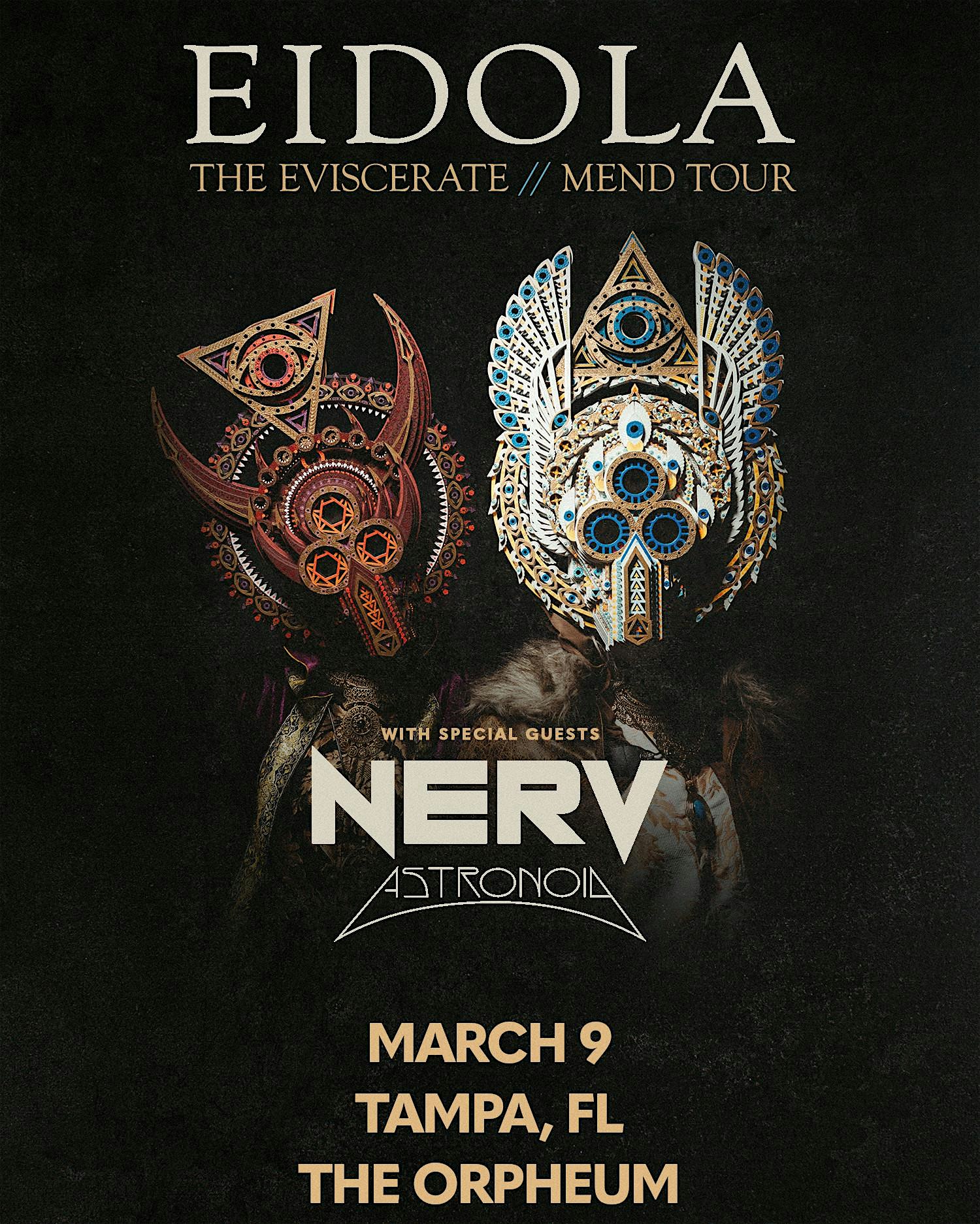 by admin13Feb EIDOLA at The Orpheum – Tampa, FL EIDOLA at The Orpheum – Tampa, FL 1 1 people viewed this event. Come see EIDOLA @ The Orpheum Tampa Florida, on Monday March 9th 2026! Tickets-RSVP Link Date And Time Monday, March 9th, 2026 10:00 PM (PST) Venue The Orpheum Location 14802 North Nebraska Avenue, Tampa, FL 33613 Event Types Concert or PerformanceMusic Event Category FloridaTampa Share With Friends Facebook Twitter Linkedin Xing Pinterest Share This Post: