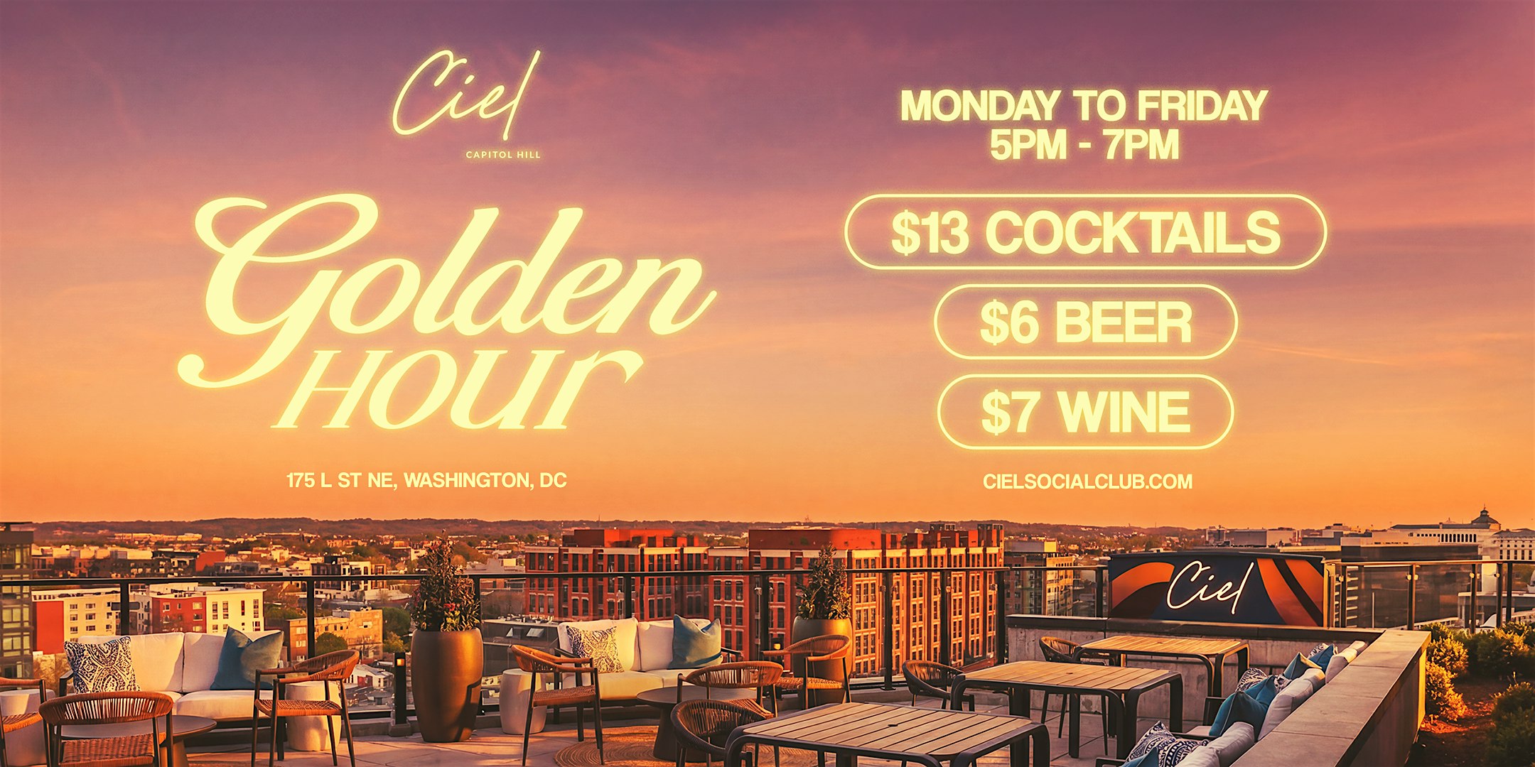 by admin27Feb Golden Hour at Ciel Capital Hill at Ciel Capitol Hill – Washington, DC Golden Hour at Ciel Capital Hill at Ciel Capitol Hill – Washington, DC 1 1 people viewed this event. Golden hour is the best hour. Join us for the happiest of hours with drink and food specials! Tickets-RSVP Link Date And Time Monday, March 9th, 2026 @ 05:00 PM Location 175 L Street Northeast, Washington, DC 20002 Event Types Food & DrinkOther Event Category Washington DC Share With Friends Facebook Twitter Linkedin Xing Pinterest Share This Post: