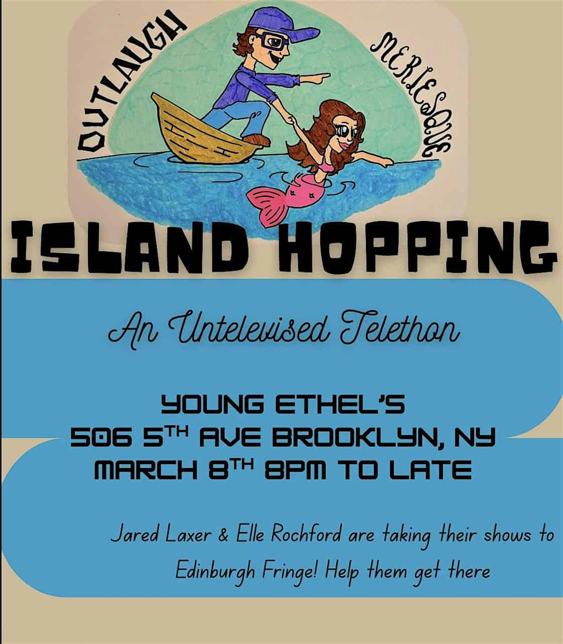 by admin14Feb Island Hopping: An Untelevised Telethon at Young Ethel’s – Brooklyn, NY Island Hopping: An Untelevised Telethon at Young Ethel’s – Brooklyn, NY 2 2 people viewed this event. Jared Laxer & Elle Rochford are taking their shows to Edinburgh Fringe Festival! Come to this fundraiser variety show to help them get there Tickets-RSVP Link Date And Time Monday, March 9th, 2026 12:00 AM (PST) Venue Young Ethel's Location 506 5th Avenue, Brooklyn, NY 11215 Event Types Concert or PerformancePerforming & Visual Arts Event Category New York Share With Friends Facebook Twitter Linkedin Xing Pinterest Share This Post: