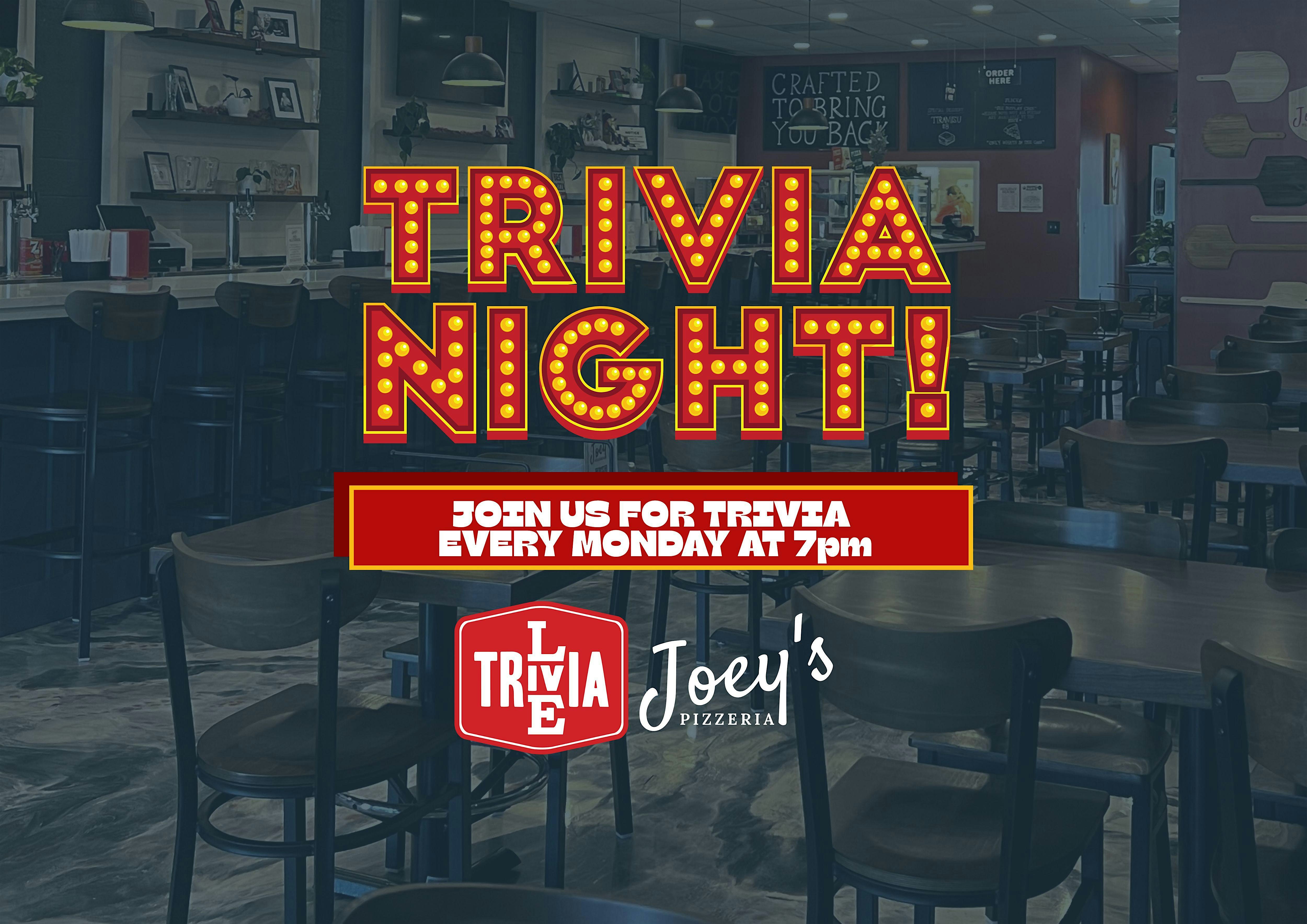 by admin05Mar Joey’s Pizzeria Trivia Night – Every Monday at 7pm! at 5060 Dorchester Rd #340 – North Charleston, SC Joey’s Pizzeria Trivia Night – Every Monday at 7pm! at 5060 Dorchester Rd #340 – North Charleston, SC 2 2 people viewed this event. Join us every Monday at 7pm for Joey’s fun-filled Trivia Night and test your pizza smarts live! Tickets-RSVP Link Date And Time Monday, March 9th, 2026 07:00 PM (PST) Venue 5060 Dorchester Rd #340 Location 5060 Dorchester Road, North Charleston, SC 29418 Event Types Food & Drink Event Category CharlestonSouth Carolina Share With Friends Facebook Twitter Linkedin Xing Pinterest Share This Post: