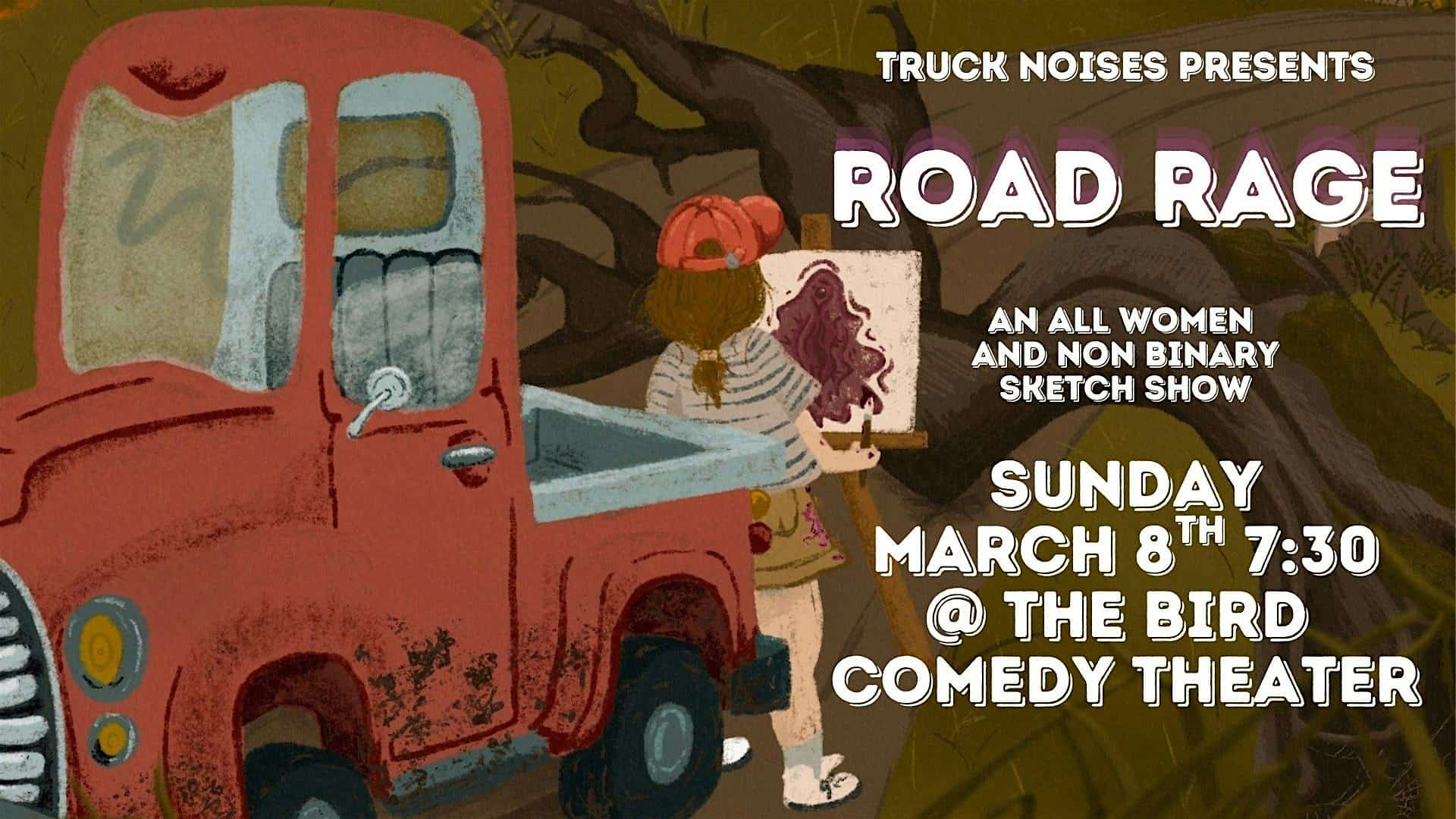by admin14Feb Truck Noises presents: ROAD RAGE at The Bird Comedy Theater – Kansas City, MO Truck Noises presents: ROAD RAGE at The Bird Comedy Theater – Kansas City, MO 3 3 people viewed this event. An All Women and Non-Binary Sketch Comedy Show Tickets-RSVP Link Date And Time Monday, March 9th, 2026 12:00 AM (PST) Venue The Bird Comedy Theater Location 103 W. 19th St, Kansas City, MO 64108 Event Types Concert or PerformancePerforming & Visual Arts Event Category Kansas CityMissouri Share With Friends Facebook Twitter Linkedin Xing Pinterest Share This Post: