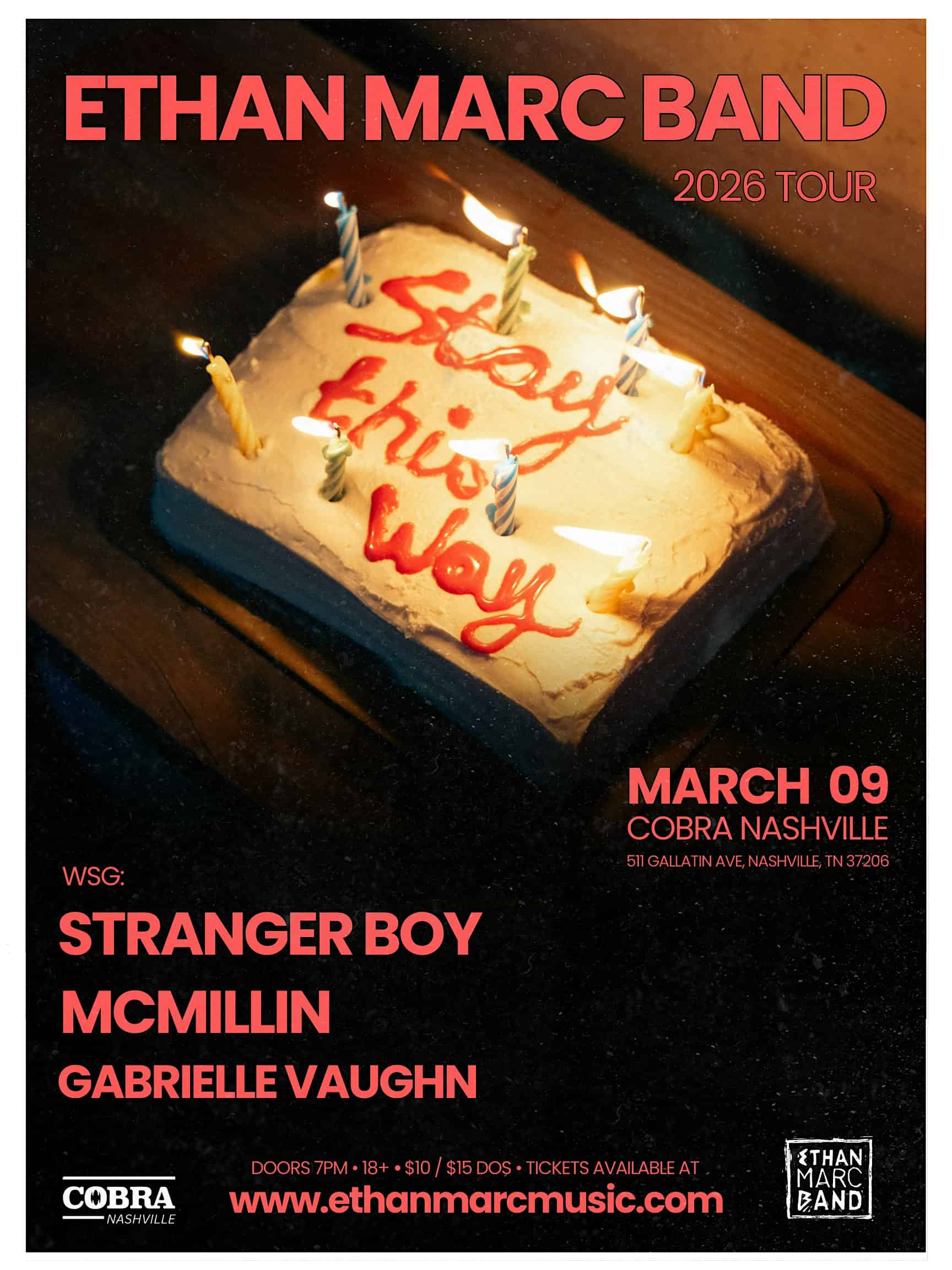 by admin23Feb Venue: Ethan Marc Band | Stranger Boy | McMillin | Gabrielle Vaughn at Cobra Nashville – Nashville, TN Venue: Ethan Marc Band | Stranger Boy | McMillin | Gabrielle Vaughn at Cobra Nashville – Nashville, TN 3 3 people viewed this event. 18 and UP + Tickets-RSVP Link Date And Time Monday, March 9th, 2026 07:00 PM (PST) Venue Cobra Nashville Location 2511 Gallatin Avenue, Nashville, TN 37206 Event Types Concert or PerformanceMusic Event Category NashvilleTennessee Share With Friends Facebook Twitter Linkedin Xing Pinterest Share This Post: