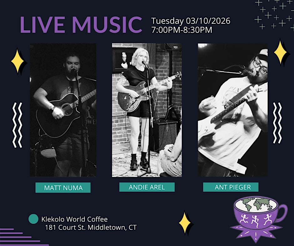 by admin14Feb ☕ Matt Numa, Andie Arel & Ant Pieger live @ Klekolo World Coffee ☕ at Klekolo World Coffee – Middletown, CT ☕ Matt Numa, Andie Arel & Ant Pieger live @ Klekolo World Coffee ☕ at Klekolo World Coffee – Middletown, CT 4 4 people viewed this event. Join us for a chill Tuesday night at Klekolo World Coffee with live music by Matt Numa, Andie Arel & Ant Pieger. Tickets-RSVP Link Date And Time Tuesday, March 10th, 2026 11:00 PM (PST) Venue Klekolo World Coffee Location 181 Court Street, Middletown, CT 6457 Event Types Concert or PerformancePerforming & Visual Arts Event Category ConnecticutHartford Share With Friends Facebook Twitter Linkedin Xing Pinterest Share This Post: