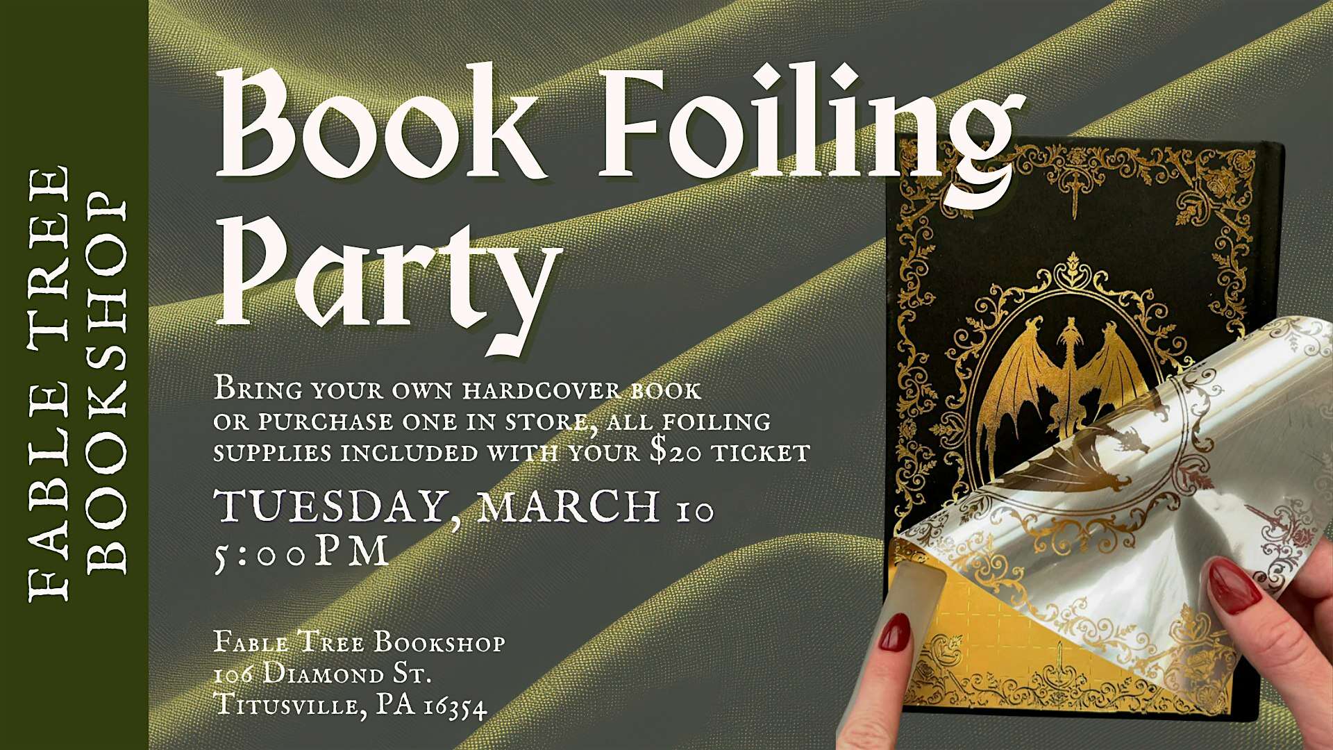 by admin23Feb Book Foiling Party at Fable Tree Bookshop at 106 Diamond St – Titusville, PA Book Foiling Party at Fable Tree Bookshop at 106 Diamond St – Titusville, PA 2 2 people viewed this event. Come embellish your favorite book with metallic foiling. Bring (or buy!) your own book, all foiling supplies included. Tickets-RSVP Link Date And Time Tuesday, March 10th, 2026 05:00 PM (PST) Venue 106 Diamond St Location 106 Diamond Street, Titusville, PA 16354 Event Types Party or Social Gathering Event Category Pennsylvania Share With Friends Facebook Twitter Linkedin Xing Pinterest Share This Post: