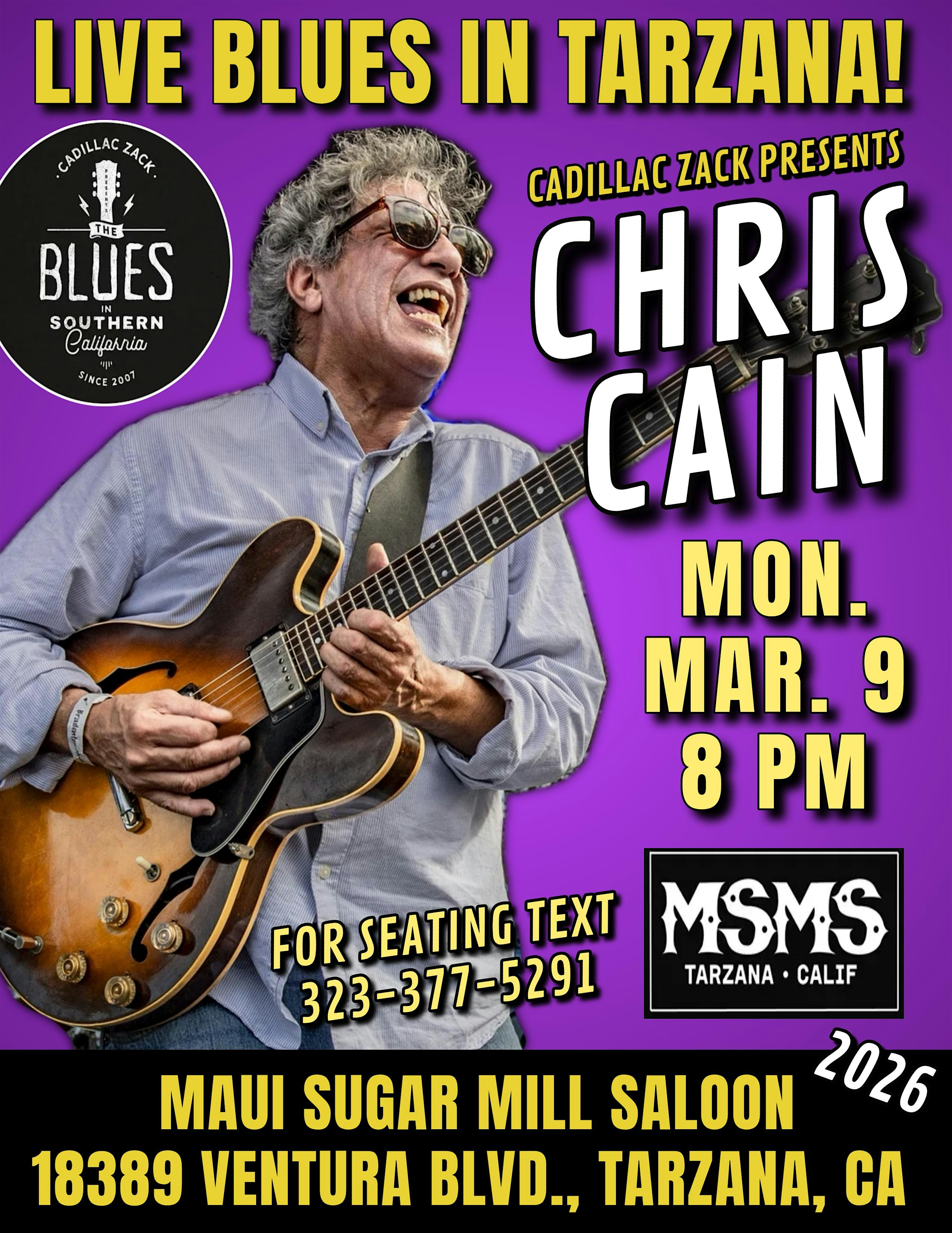 by admin13Feb CHRIS CAIN – Blues Guitar Legend – in Tarzana! at Maui Sugar Mill Saloon – Los Angeles, CA CHRIS CAIN – Blues Guitar Legend – in Tarzana! at Maui Sugar Mill Saloon – Los Angeles, CA 2 2 people viewed this event. CHRIS CAIN – Blues Guitar Legend – in Tarzana! Tickets-RSVP Link Date And Time Tuesday, March 10th, 2026 03:00 AM (PST) Venue Maui Sugar Mill Saloon Location 18389 Ventura Boulevard, Los Angeles, CA 91356 Event Types Concert or PerformanceMusic Event Category CaliforniaLos Angeles Share With Friends Facebook Twitter Linkedin Xing Pinterest Share This Post: