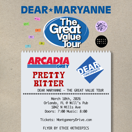 Montgomery Drive Presents Dear MaryanneArcadia GreyPretty BitterDear Cincinnati Tuesday, March 10th, 2026Wills Pub – Orlando, FL7PM Doors / 18 Plus