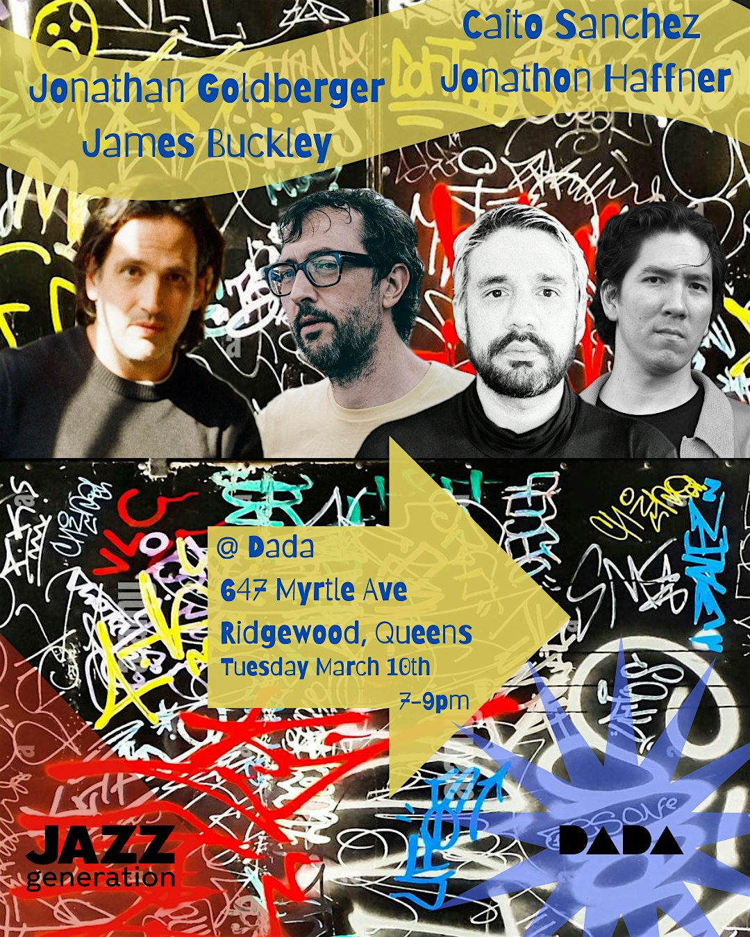 by admin27Feb Jazz – James Buckley, Jonathan Goldberger, Jonathon Haffner, Caito Sanchez at Dada – Queens, NY Jazz – James Buckley, Jonathan Goldberger, Jonathon Haffner, Caito Sanchez at Dada – Queens, NY 2 2 people viewed this event. This Brooklyn-based quartet brings together four heavy-hitters, fusing elements of avant-garde jazz, deep groove, and free-flowing improv! Tickets-RSVP Link Date And Time Tuesday, March 10th, 2026 07:00 PM (PST) Venue Dada Location 6047 Myrtle Avenue, Queens, NY 11385 Event Types Concert or PerformanceMusic Event Category New YorkNew York City Share With Friends Facebook Twitter Linkedin Xing Pinterest Share This Post: