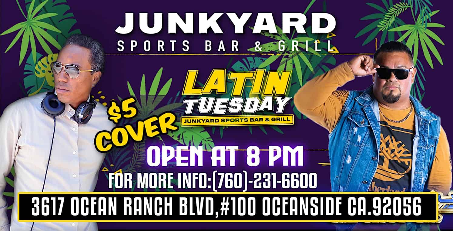 by admin23Feb Latin Tuesdays at Junkyard Sports Bar & Grill – Oceanside, CA Latin Tuesdays at Junkyard Sports Bar & Grill – Oceanside, CA 2 2 people viewed this event. Get ready to spice up your week — Latin Tuesdays at Junkyard are bringing the flavor, fire, and fiesta you didn’t know your Tuesday needed! Tickets-RSVP Link Date And Time Tuesday, March 10th, 2026 08:00 PM (PST) Venue Junkyard Sports Bar & Grill Location 3617 Ocean Ranch Boulevard, Oceanside, CA 92056 Event Types MusicParty or Social Gathering Event Category California Share With Friends Facebook Twitter Linkedin Xing Pinterest Share This Post: