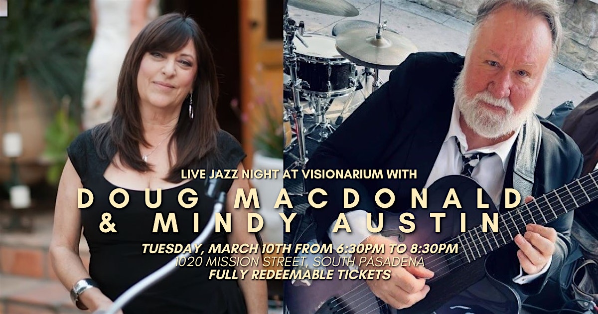 by admin27Feb Live Jazz Night at Visionarium Live Italian at 1020 Mission St – South Pasadena, CA Live Jazz Night at Visionarium Live Italian at 1020 Mission St – South Pasadena, CA 2 2 people viewed this event. Join us for another special night with Doug MacDonald and Mindy Austin, two artists known for their musical chemistry and expressive jazz! Tickets-RSVP Link Date And Time Tuesday, March 10th, 2026 06:00 PM (PST) Venue 1020 Mission St Location 1020 Mission Street, South Pasadena, CA 91030 Event Types Concert or PerformanceMusic Event Category CaliforniaLos Angeles Share With Friends Facebook Twitter Linkedin Xing Pinterest Share This Post: