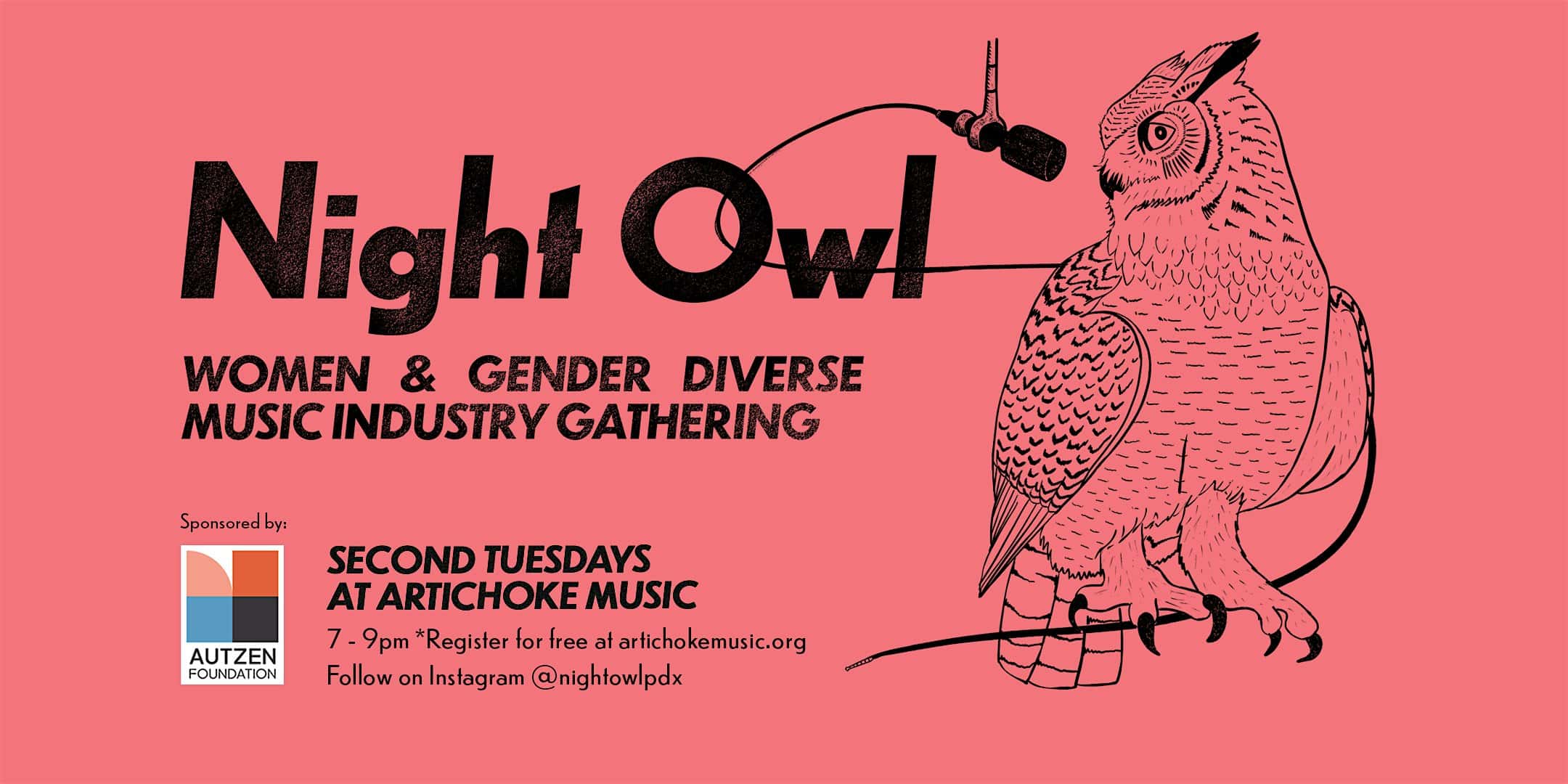by admin23Feb NIGHT OWL: Women and Gender Expansive Music Industry Gathering at Artichoke Community Music – Portland, OR NIGHT OWL: Women and Gender Expansive Music Industry Gathering at Artichoke Community Music – Portland, OR 2 2 people viewed this event. PODCAST INTERVIEW • OPEN DISCUSSION • RESOURCE SHARING • NETWORKING Second Tuesdays at Artichoke Music Audience is open to all Tickets-RSVP Link Date And Time Tuesday, March 10th, 2026 07:00 PM (PST) Venue Artichoke Community Music Location 2007 Southeast Powell Boulevard, Portland, OR 97202 Event Types Music Event Category OregonPortland Share With Friends Facebook Twitter Linkedin Xing Pinterest Share This Post: