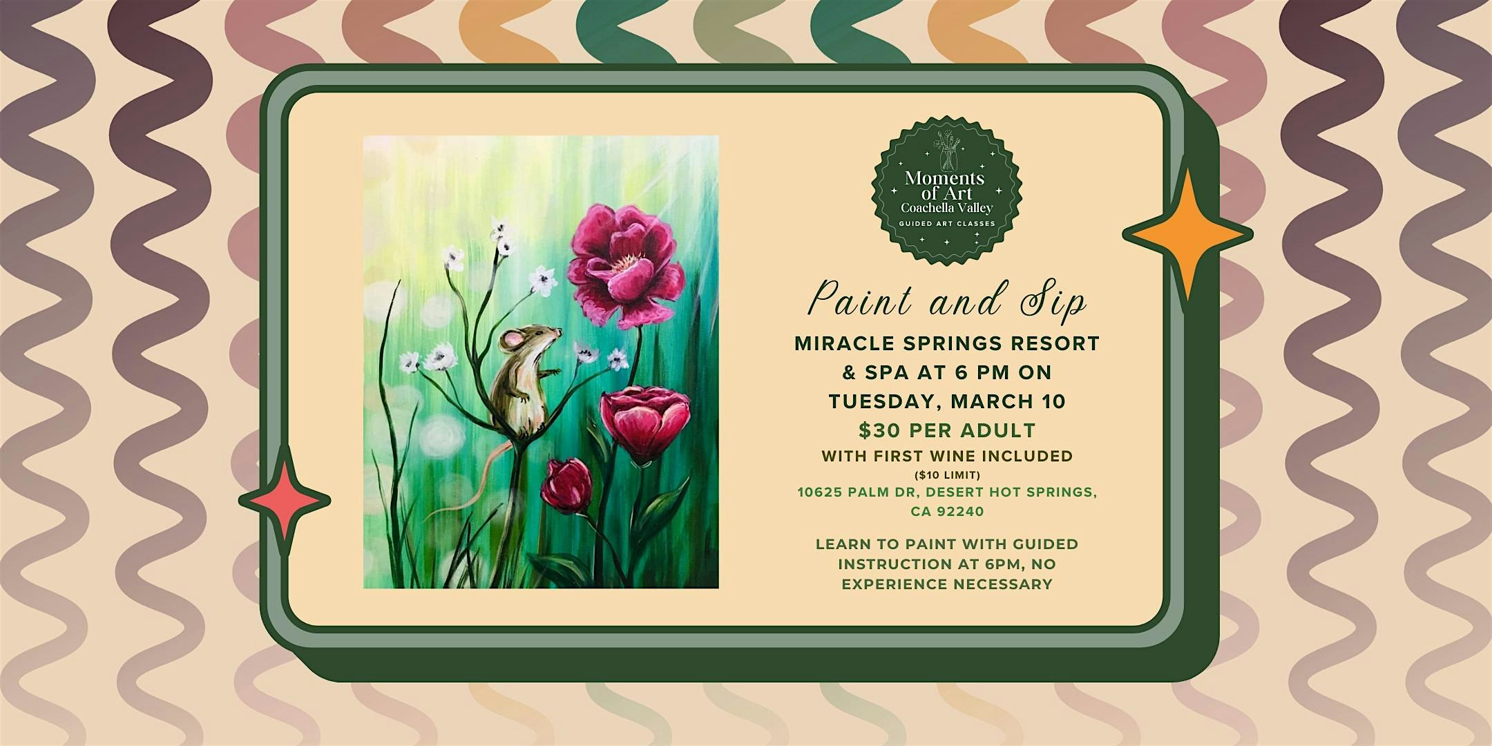 by admin27Feb Springs Mouse Paint and Sip with First Drink Included at Miracle Springs Resort & Spa – Desert Hot Springs, CA Springs Mouse Paint and Sip with First Drink Included at Miracle Springs Resort & Spa – Desert Hot Springs, CA 2 2 people viewed this event. Paint fun mice, sip your first drink on us, and unleash your inner artist at Springs Mouse Paint and Sip! Tickets-RSVP Link Date And Time Tuesday, March 10th, 2026 06:00 PM (PST) Venue Miracle Springs Resort & Spa Location 10625 Palm Drive, Desert Hot Springs, CA 92240 Event Types Food & Drink Event Category California Share With Friends Facebook Twitter Linkedin Xing Pinterest Share This Post: