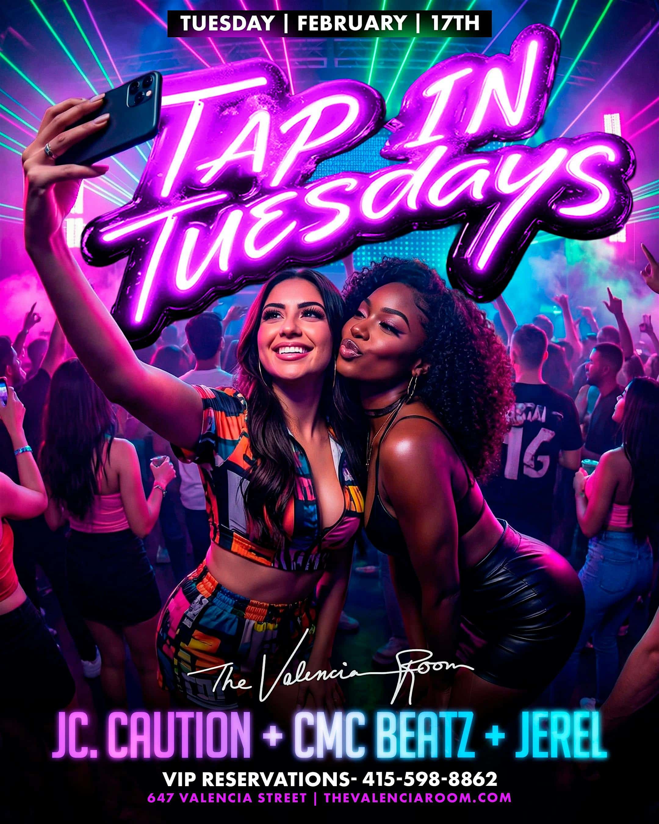 by admin23Feb TAP IN TUESDAYS at The Valencia Room – SAN FRANCISCO, CA TAP IN TUESDAYS at The Valencia Room – SAN FRANCISCO, CA 2 2 people viewed this event. Hip Hop / R&B / Reggaeton – Every Tues Nite! Tickets-RSVP Link Date And Time Tuesday, March 10th, 2026 10:00 PM (PST) Venue The Valencia Room Location 647 Valencia Street, SAN FRANCISCO, CA 94110 Event Types MusicParty or Social Gathering Event Category CaliforniaSan Francisco Share With Friends Facebook Twitter Linkedin Xing Pinterest Share This Post: