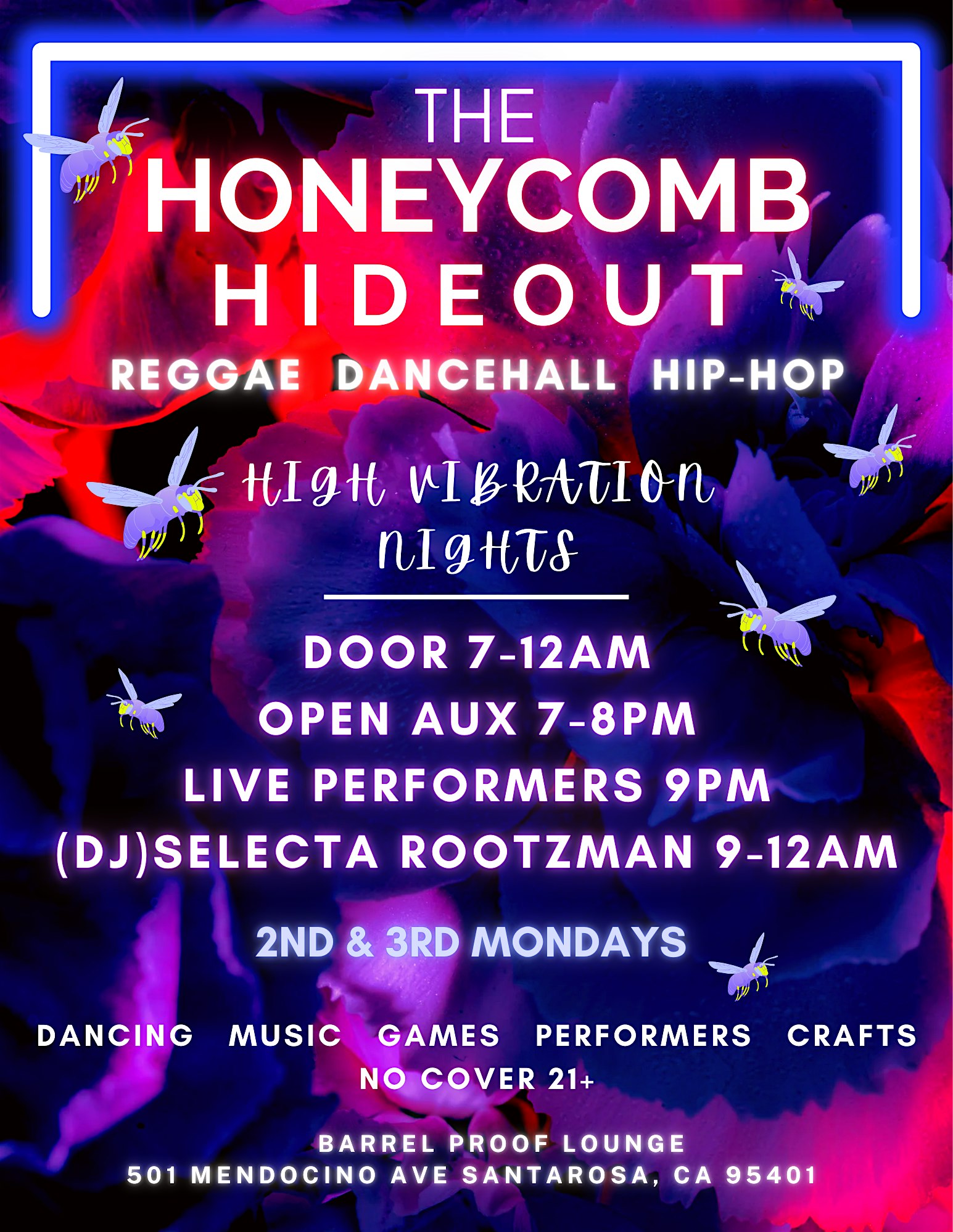 by admin13Feb The Honeycomb Hideout: Live Music | DJ |Drink Specials | Reggae | Dancehall at Barrel Proof Lounge – Santa Rosa, CA The Honeycomb Hideout: Live Music | DJ |Drink Specials | Reggae | Dancehall at Barrel Proof Lounge – Santa Rosa, CA 1 1 people viewed this event. Come hang out at The Honeycomb Hideout for live music, awesome drink specials, and delicious local food all night long! Tickets-RSVP Link Date And Time Tuesday, March 10th, 2026 02:00 AM (PST) Venue Barrel Proof Lounge Location 501 Mendocino Avenue, Santa Rosa, CA 95401 Event Types MusicParty or Social Gathering Event Category California Share With Friends Facebook Twitter Linkedin Xing Pinterest Share This Post: