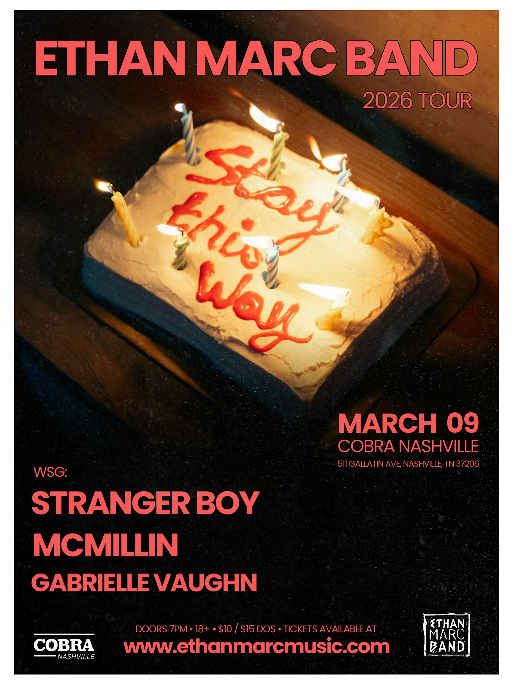 by admin13Feb Venue: Ethan Marc Band | Stranger Boy | McMillin | Gabrielle Vaughn at Cobra Nashville – Nashville, TN Venue: Ethan Marc Band | Stranger Boy | McMillin | Gabrielle Vaughn at Cobra Nashville – Nashville, TN 1 1 people viewed this event. 18 and UP + Tickets-RSVP Link Date And Time Tuesday, March 10th, 2026 12:00 AM (PST) Venue Cobra Nashville Location 2511 Gallatin Avenue, Nashville, TN 37206 Event Types Concert or PerformanceMusic Event Category NashvilleTennessee Share With Friends Facebook Twitter Linkedin Xing Pinterest Share This Post: