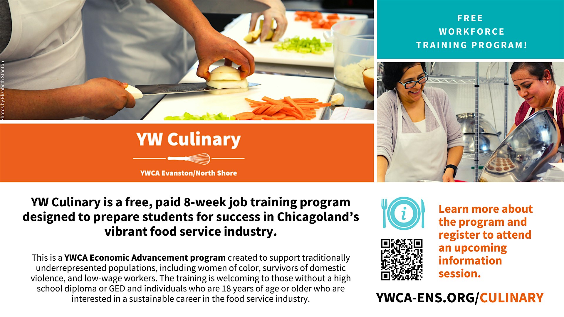 by admin27Feb YW Culinary Information Session at YWCA Evanston/North Shore – Evanston, IL YW Culinary Information Session at YWCA Evanston/North Shore – Evanston, IL 1 1 people viewed this event. YW Culinary is a free job training program designed to prepare students to work in Chicagoland’s food service industry. Tickets-RSVP Link Date And Time Tuesday, March 10th, 2026 10:00 AM (PST) Venue YWCA Evanston/North Shore Location 1215 Church Street, Evanston, IL 60201 Event Types Food & Drink Event Category ChicagoIllinois Share With Friends Facebook Twitter Linkedin Xing Pinterest Share This Post: