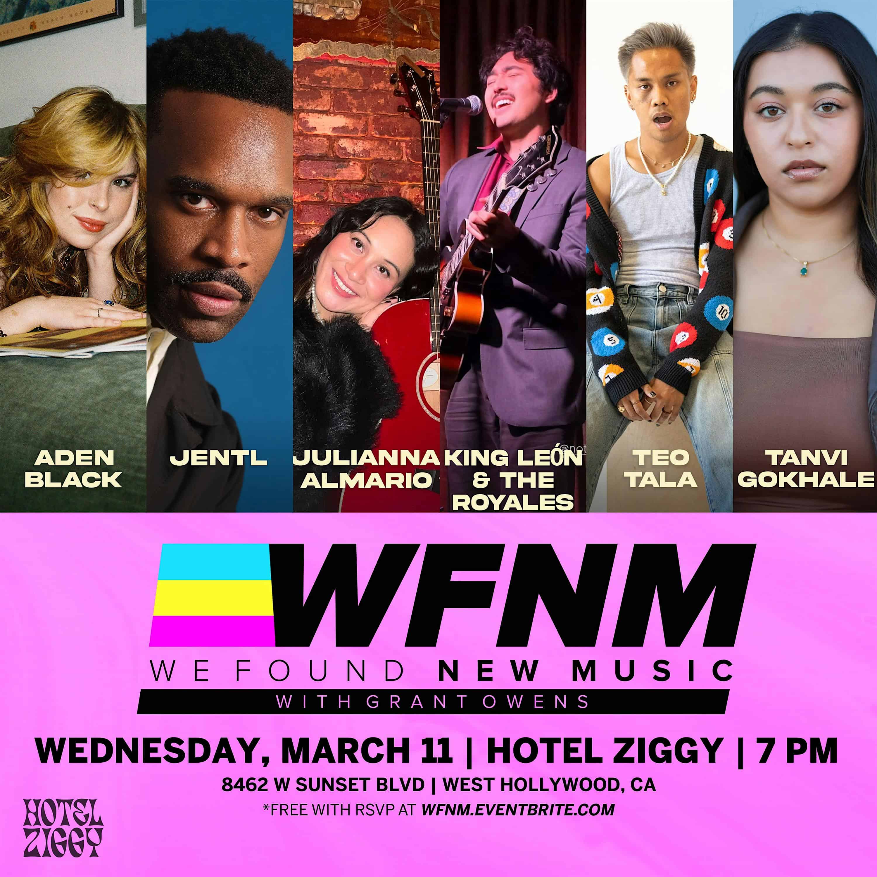 by admin23Feb Aden Black/JENTL/Julianna Almario/King León Royales/teo tala/Tanvi Gokhale at Hotel Ziggy Los Angeles – West Hollywood, CA Aden Black/JENTL/Julianna Almario/King León Royales/teo tala/Tanvi Gokhale at Hotel Ziggy Los Angeles – West Hollywood, CA 2 2 people viewed this event. WE FOUND NEW MUSIC Artist Discovery Concert Series LOCATION: Hotel Ziggy Free with RSVP 7:00pm Doors Tickets-RSVP Link Date And Time Wednesday, March 11th, 2026 07:00 PM (PST) Venue Hotel Ziggy Los Angeles Location 8462 West Sunset Boulevard, West Hollywood, CA 90069 Event Types Concert or PerformanceMusic Event Category California Share With Friends Facebook Twitter Linkedin Xing Pinterest Share This Post: