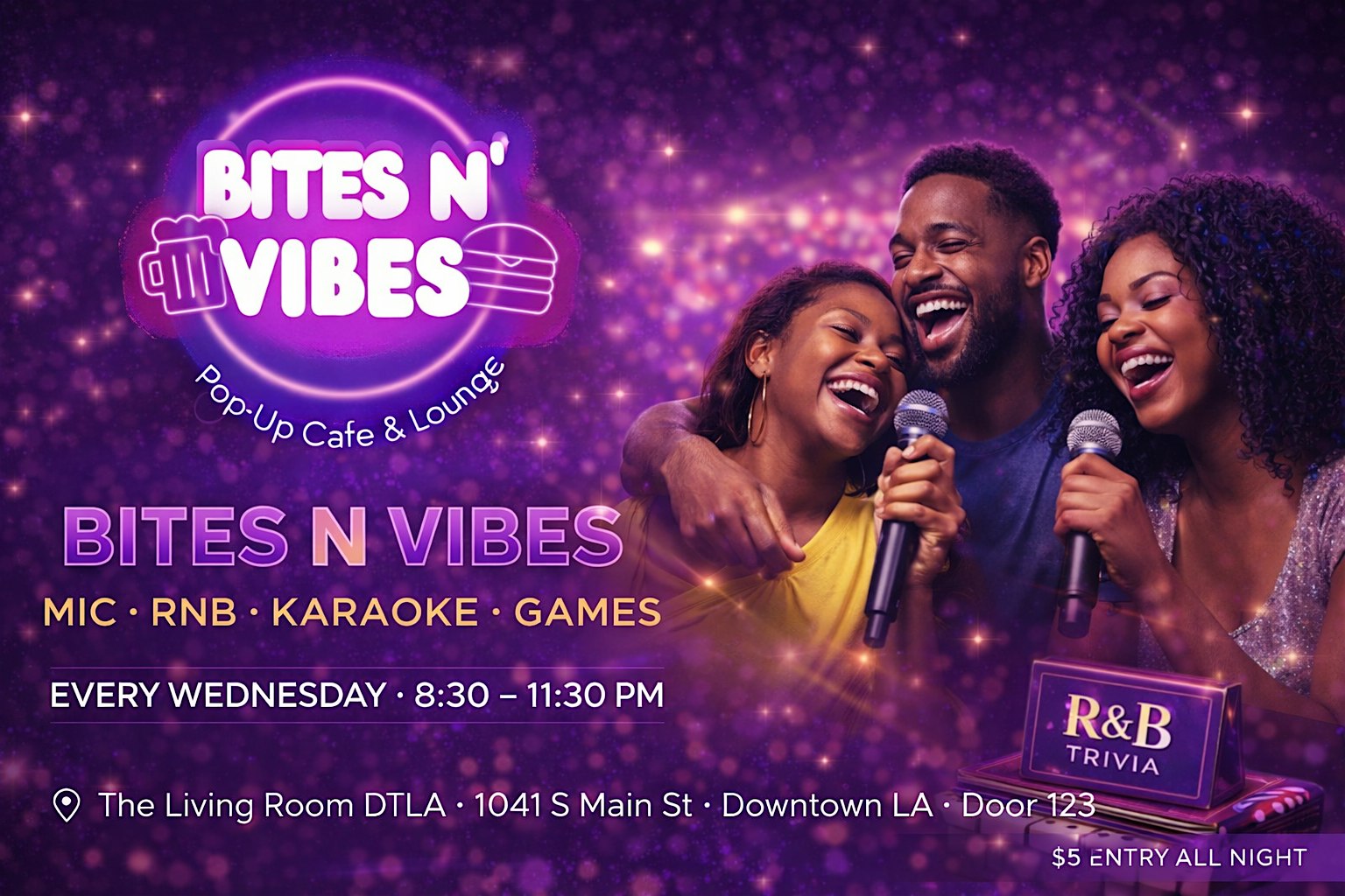 by admin23Feb Bites N Vibes at The Living Room DTLA – Los Angeles, CA Bites N Vibes at The Living Room DTLA – Los Angeles, CA 3 3 people viewed this event. A midweek hang with bites, R&B, karaoke, games, and open mic energy. Tickets-RSVP Link Date And Time Wednesday, March 11th, 2026 08:00 PM (PST) Venue The Living Room DTLA Location 1041 Main Street, Los Angeles, CA 90015 Event Types Food & DrinkParty or Social Gathering Event Category CaliforniaLos Angeles Share With Friends Facebook Twitter Linkedin Xing Pinterest Share This Post: