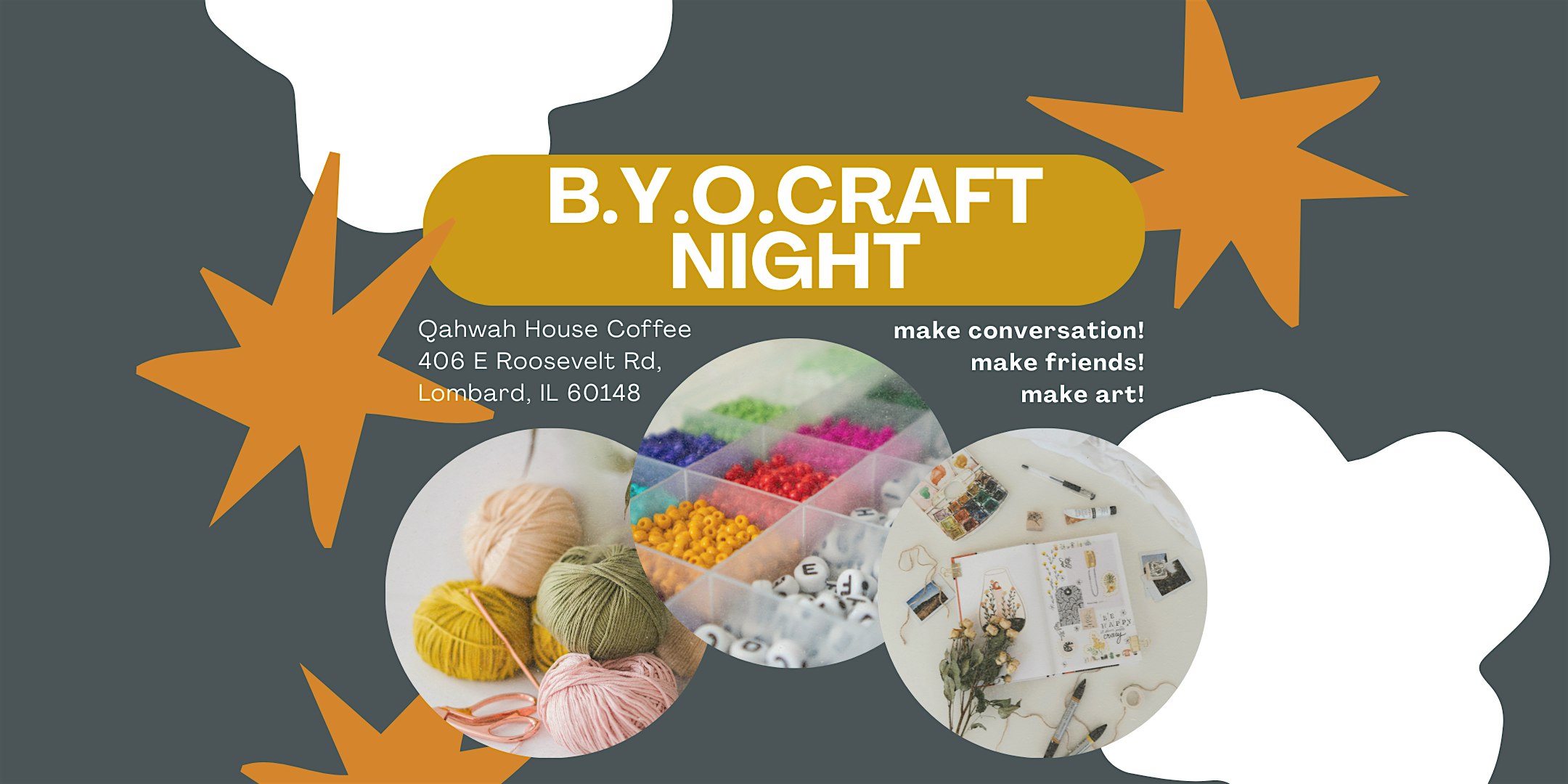by admin05Mar BYOC: bring your own craft night! at Qahwah House Coffee – Lombard – Lombard, IL BYOC: bring your own craft night! at Qahwah House Coffee – Lombard – Lombard, IL 3 3 people viewed this event. from crocheting to scrapbooking to making jewelry, bring your craft WIP to make conversation, make friends, and make art! Tickets-RSVP Link Date And Time Wednesday, March 11th, 2026 07:00 PM (PST) Venue Qahwah House Coffee - Lombard Location 406 East Roosevelt Road, Lombard, IL 60148 Event Types Party or Social Gathering Event Category Illinois Share With Friends Facebook Twitter Linkedin Xing Pinterest Share This Post: