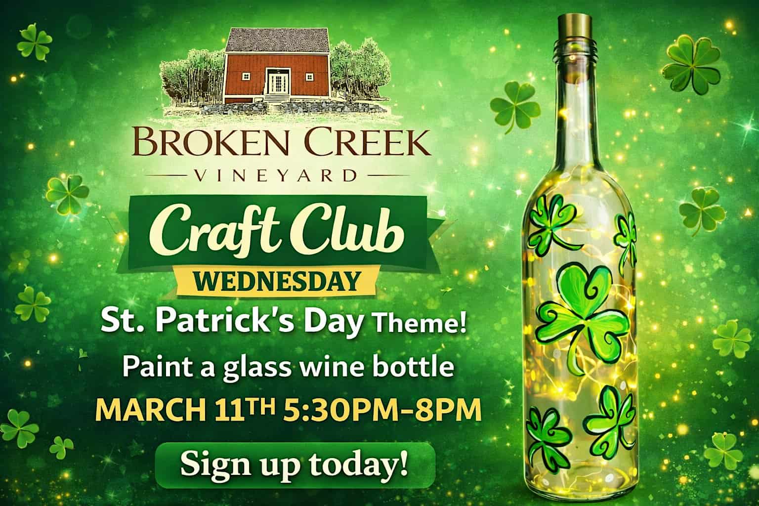 by admin14Feb Craft Club Wednesday: Paint a St. Patricks Themed Wine Bottle at Broken Creek Vineyard and Winery – Shrewsbury, MA Craft Club Wednesday: Paint a St. Patricks Themed Wine Bottle at Broken Creek Vineyard and Winery – Shrewsbury, MA 2 2 people viewed this event. The perfect mid-week night out! Join us to paint a St. Patricks-themed glass wine bottle! Tickets-RSVP Link Date And Time Wednesday, March 11th, 2026 09:00 PM (PST) Venue Broken Creek Vineyard and Winery Location 614 South Street, Shrewsbury, MA 1545 Event Types Food & Drink Event Category Massachusetts Share With Friends Facebook Twitter Linkedin Xing Pinterest Share This Post: