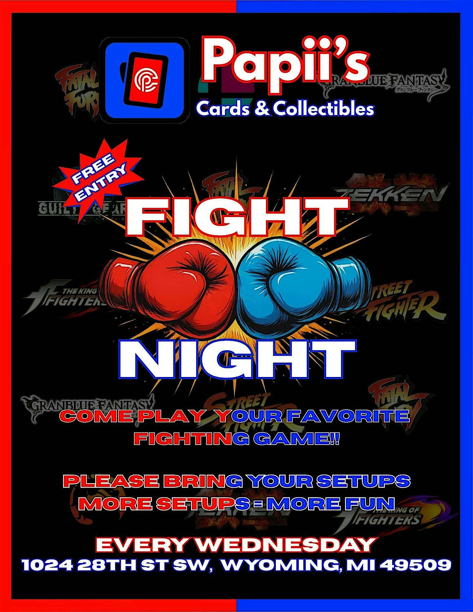 by admin14Feb Fight Night @ PCC at Papii’s Cards & Collectibles – Wyoming, MI Fight Night @ PCC at Papii’s Cards & Collectibles – Wyoming, MI 2 2 people viewed this event. Gamers, put on your gloves and grab your controllers!! Come play your favorite fighting game on Wednesdays at Papii’s Cards & Collectibles! Tickets-RSVP Link Date And Time Wednesday, March 11th, 2026 04:00 PM (PST) Venue Papii's Cards & Collectibles Location 1024 28th Street Southwest, Wyoming, MI 49509 Event Types Concert or PerformanceSports & Fitness Event Category Michigan Share With Friends Facebook Twitter Linkedin Xing Pinterest Share This Post: