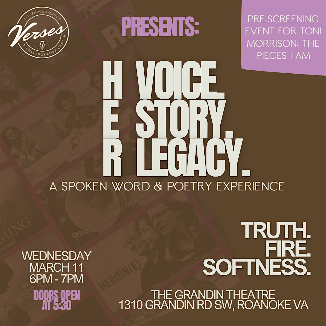 by admin05Mar HER Voice HER Story HER Legacy at The Grandin Theatre – Roanoke, VA HER Voice HER Story HER Legacy at The Grandin Theatre – Roanoke, VA 1 1 people viewed this event. Before the film. Before the lights dim. Before her words fill the screen-we gather for a night of truth telling, rhythm and reverence. Tickets-RSVP Link Date And Time Wednesday, March 11th, 2026 06:00 PM (PST) Venue The Grandin Theatre Location 1310 Grandin Road Southwest, Roanoke, VA 24015 Event Types Concert or PerformancePerforming & Visual Arts Event Category Virginia Share With Friends Facebook Twitter Linkedin Xing Pinterest Share This Post: