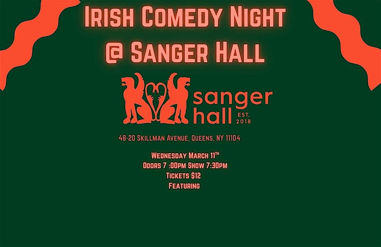 by admin14Feb Irish Comedy Night at Sanger Hall at Sanger Hall – Queens, NY Irish Comedy Night at Sanger Hall at Sanger Hall – Queens, NY 2 2 people viewed this event. Join us for all of the laughs as we present a night of Irish Comedy at Sanger Hall! Tickets-RSVP Link Date And Time Wednesday, March 11th, 2026 11:00 PM (PST) Venue Sanger Hall Location 48-20 Skillman Avenue, Queens, NY 11104 Event Types Concert or PerformancePerforming & Visual Arts Event Category New YorkNew York City Share With Friends Facebook Twitter Linkedin Xing Pinterest Share This Post: