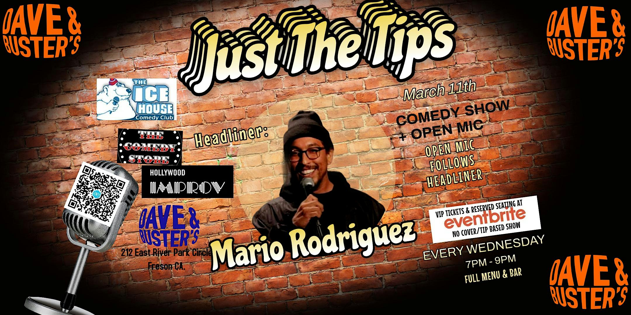 by admin05Mar Just The Tips Comedy Show Headlining Mario Rodriguez + Open-Mic at Dave & Buster’s Fresno – Fresno, CA Just The Tips Comedy Show Headlining Mario Rodriguez + Open-Mic at Dave & Buster’s Fresno – Fresno, CA 3 3 people viewed this event. TIP BASED SHOW/ Tips expected suggested Tip $10/ Comedy from BOB N TOM,Comedy Central, BET with open mic to follow. FULL Menu and Bar Tickets-RSVP Link Date And Time Wednesday, March 11th, 2026 07:00 PM (PST) Venue Dave & Buster's Fresno Location 212 East River Park Circle, Fresno, CA 93720 Event Types Concert or PerformancePerforming & Visual Arts Event Category California Share With Friends Facebook Twitter Linkedin Xing Pinterest Share This Post: