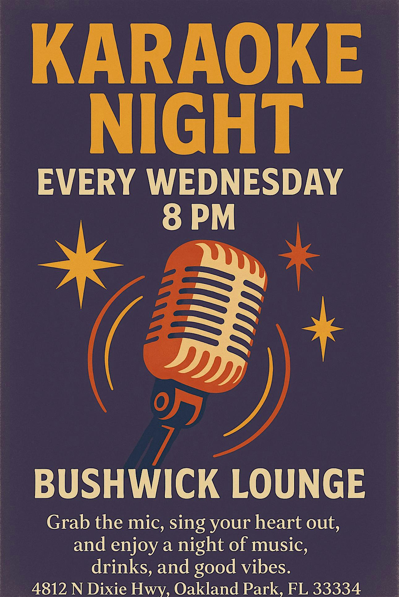 by admin27Feb Karaoke Night at Bushwick Lounge – Oakland Park, FL Karaoke Night at Bushwick Lounge – Oakland Park, FL 1 1 people viewed this event. Karaoke Night with DJ Ray Star Every Wednesday at 8 PM Bushwick Lounge 4812 N Dixie Hwy, Oakland Park, FL 33334 Sing your heart out, sip you Tickets-RSVP Link Date And Time Wednesday, March 11th, 2026 08:00 PM (PST) Venue Bushwick Lounge Location 4812 Dixie Highway, Oakland Park, FL 33334 Event Types MusicParty or Social Gathering Event Category Florida Share With Friends Facebook Twitter Linkedin Xing Pinterest Share This Post: