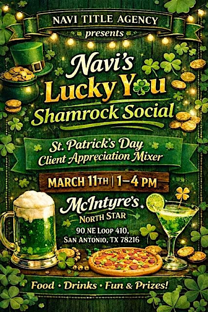 by admin23Feb Navi’s Lucky You Shamrock Social: Client Appreciation Event at McIntyre’s North Star – San Antonio, TX Navi’s Lucky You Shamrock Social: Client Appreciation Event at McIntyre’s North Star – San Antonio, TX 2 2 people viewed this event. We are so LUCKY to be in business with you – help us celebrate our clients at this mixer with dynamic vendors and fun raffle prizes! Tickets-RSVP Link Date And Time Wednesday, March 11th, 2026 01:00 PM (PST) Venue McIntyre's North Star Location 90 Northeast Interstate 410 Loop, San Antonio, TX 78216 Event Types Party or Social Gathering Event Category San AntonioTexas Share With Friends Facebook Twitter Linkedin Xing Pinterest Share This Post:
