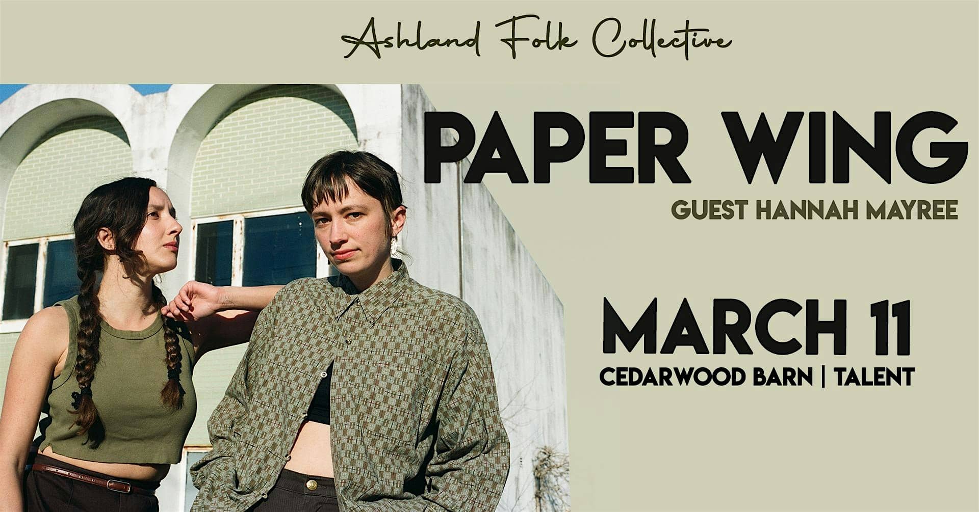 by admin23Feb Paper Wing with guest Hannah Mayree presented by the Ashland Folk Collectiv at Cedarwood Farm Barn Show – Talent, OR Paper Wing with guest Hannah Mayree presented by the Ashland Folk Collectiv at Cedarwood Farm Barn Show – Talent, OR 2 2 people viewed this event. Catch Paper Wing live with Hannah Mayree, hosted by Ashland Folk Collectiv—good vibes, great tunes! Tickets-RSVP Link Date And Time Wednesday, March 11th, 2026 07:00 PM (PST) Venue Cedarwood Farm Barn Show Location 7912 Wagner creek, Talent, OR 97540 Event Types Concert or PerformanceMusic Event Category Oregon Share With Friends Facebook Twitter Linkedin Xing Pinterest Share This Post: