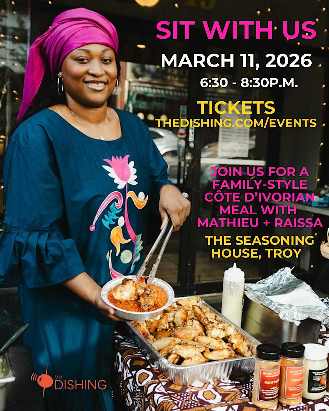 by admin27Feb SIT WITH US : The Dishing x The Seasoning House, Troy at The Seasoning House – Troy, NY SIT WITH US : The Dishing x The Seasoning House, Troy at The Seasoning House – Troy, NY 1 1 people viewed this event. Join us 3/11/26 for a 3-course Côte d’Ivorian family-style dinner by Mathieu + Raissa of The Seasoning House. ($50, includes tax + tip.) Tickets-RSVP Link Date And Time Wednesday, March 11th, 2026 06:00 PM (PST) Venue The Seasoning House Location 49 3rd Street, Troy, NY 12180 Event Types Food & DrinkParty or Social Gathering Event Category New York Share With Friends Facebook Twitter Linkedin Xing Pinterest Share This Post: