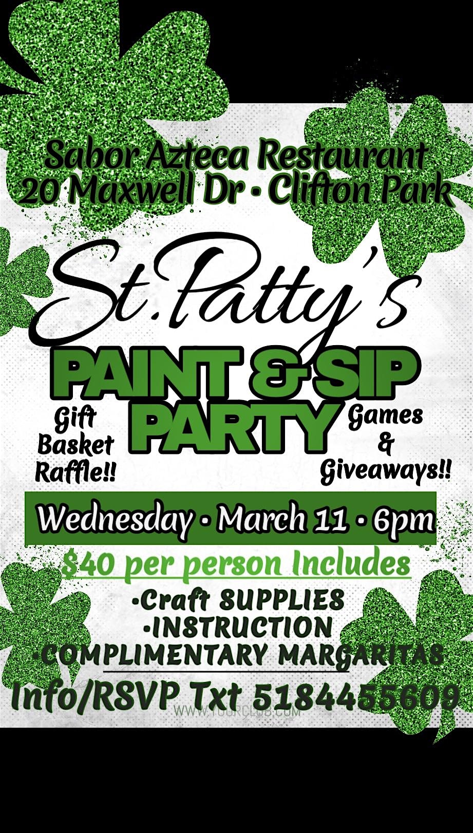 by admin23Feb St Patty’s Paint and Sip at Sabor Azteca – Clifton Park, NY St Patty’s Paint and Sip at Sabor Azteca – Clifton Park, NY 2 2 people viewed this event. Grab a drink, paint some green, and sip your way through St Patty’s fun with friends! Bottle giveaway! Green is the theme for this event!! Tickets-RSVP Link Date And Time Wednesday, March 11th, 2026 06:00 PM (PST) Venue Sabor Azteca Location 20 Maxwell Drive, Clifton Park, NY 12065 Event Types Food & Drink Event Category New York Share With Friends Facebook Twitter Linkedin Xing Pinterest Share This Post: