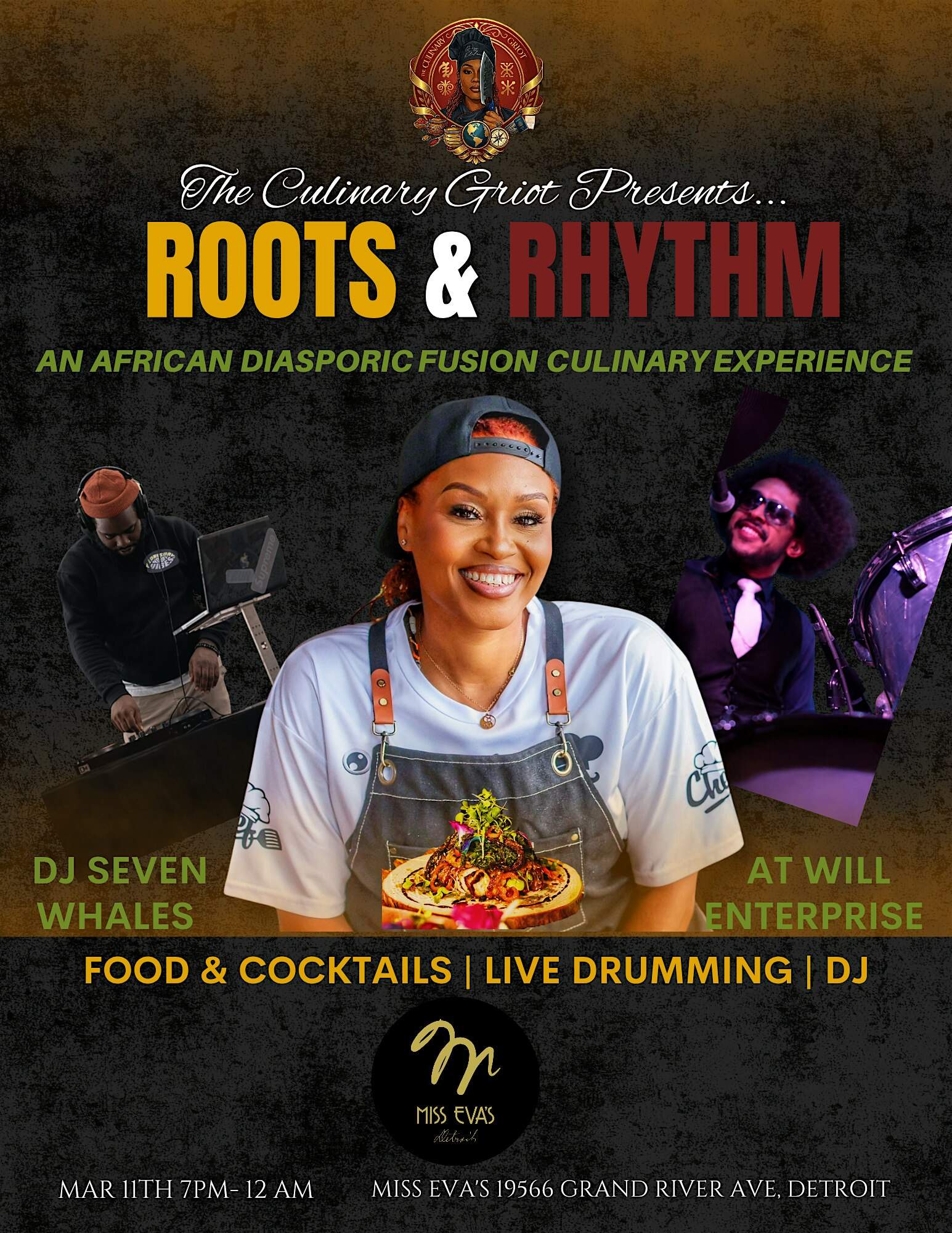 by admin05Mar THE CULINARY GRIOT PRESENTS: ROOTS & RHYTHM at Miss Eva’s Detroit – Detroit, MI THE CULINARY GRIOT PRESENTS: ROOTS & RHYTHM at Miss Eva’s Detroit – Detroit, MI 4 4 people viewed this event. Rhythm. Flavor. Movement. Roots & Rhythm is a culinary experience celebrating the African diaspora through food and music. Tickets-RSVP Link Date And Time Wednesday, March 11th, 2026 07:00 PM (PDT) Venue Miss Eva's Detroit Location 19566 Grand River Avenue, Detroit, MI 48223 Event Types Food & DrinkParty or Social Gathering Event Category DetroitMichigan Share With Friends Facebook Twitter Linkedin Xing Pinterest Share This Post: