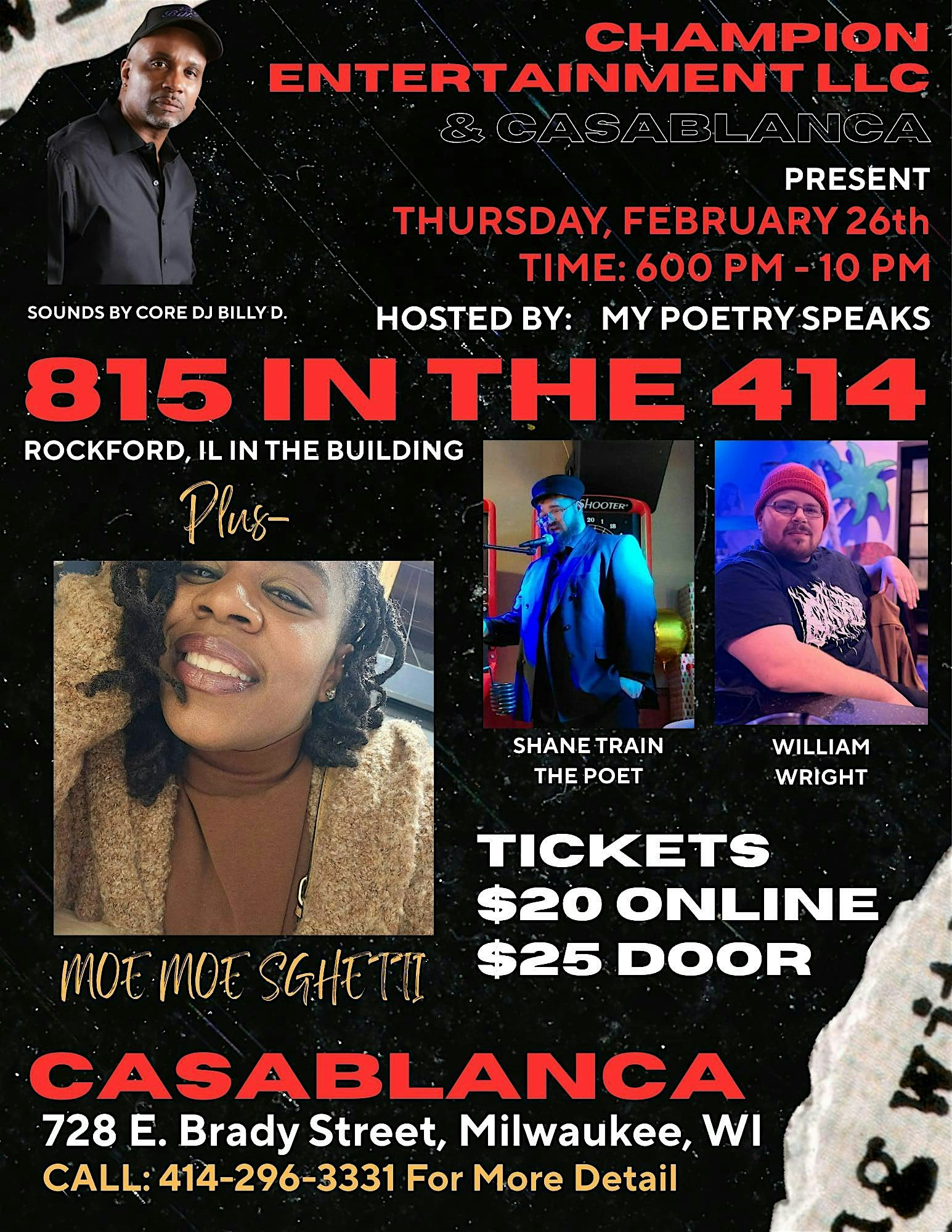 by admin27Feb 815 in the 414 at 728 E Brady St – Milwaukee, WI 815 in the 414 at 728 E Brady St – Milwaukee, WI 1 1 people viewed this event. This week ROCKFORD ILLINOIS WILL BE IN THE BUILDING…. SHANE TRAIN THE POET , WILLIAM WRIGHT. SAMANTHA THE POET, AND MANY MORE Tickets-RSVP Link Date And Time Thursday, March 12th, 2026 06:00 PM (PST) Venue 728 E Brady St Location 728 East Brady Street, Milwaukee, WI 53202 Event Types Concert or PerformanceMusic Event Category MilwaukeeWisconsin Share With Friends Facebook Twitter Linkedin Xing Pinterest Share This Post: