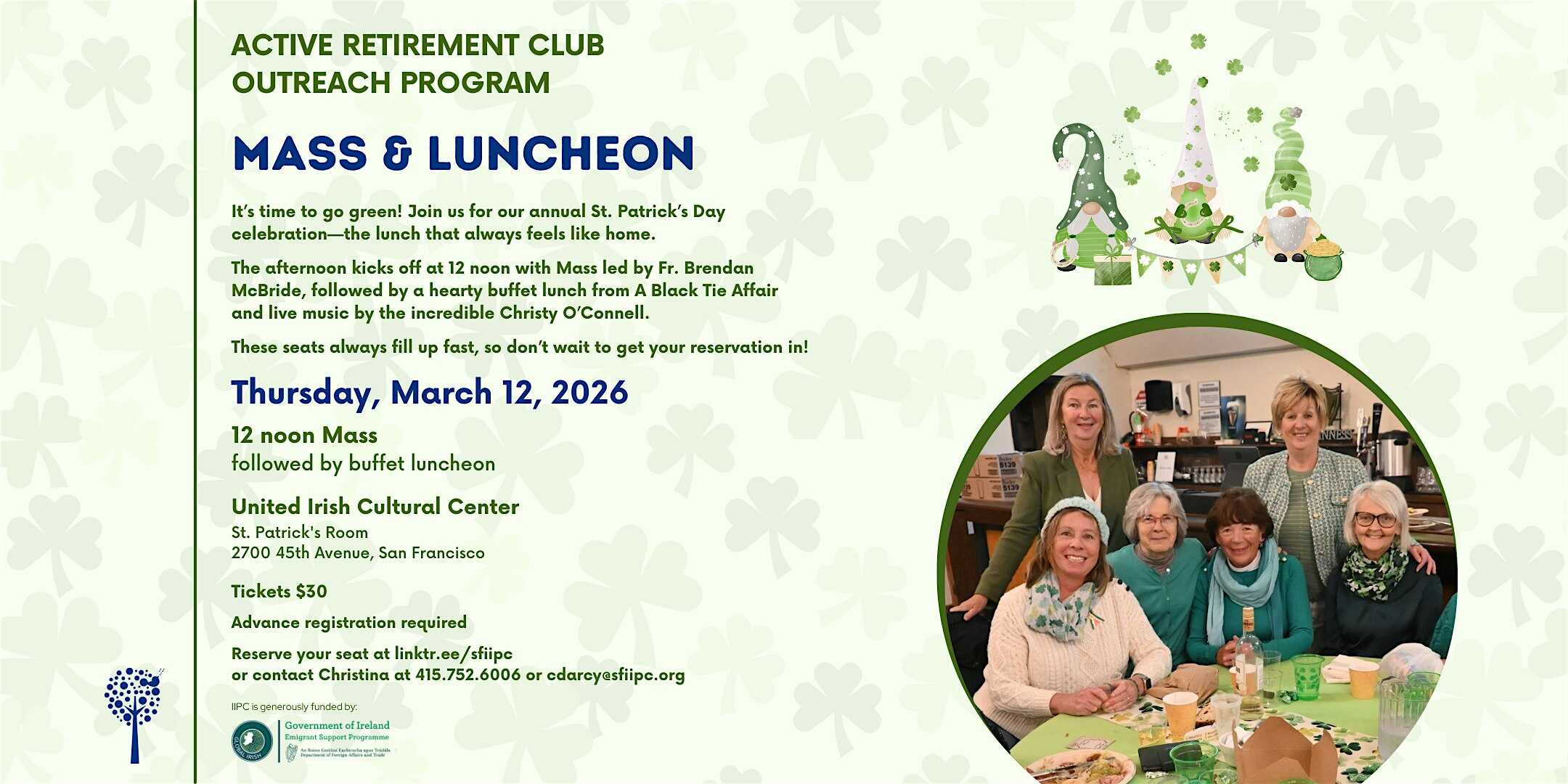 by admin23Feb Active Retirement Mass and Luncheon | Thursday, March 12, 2026 at United Irish Cultural Center – San Francisco, CA Active Retirement Mass and Luncheon | Thursday, March 12, 2026 at United Irish Cultural Center – San Francisco, CA 2 2 people viewed this event. It’s time to go green! Join us for our annual St. Patrick’s Day celebration—the lunch that always feels like home. Tickets-RSVP Link Date And Time Thursday, March 12th, 2026 12:00 PM (PST) Venue United Irish Cultural Center Location 2700 45th Avenue, San Francisco, CA 94116 Event Types Community & CultureParty or Social Gathering Event Category CaliforniaSan Francisco Share With Friends Facebook Twitter Linkedin Xing Pinterest Share This Post: