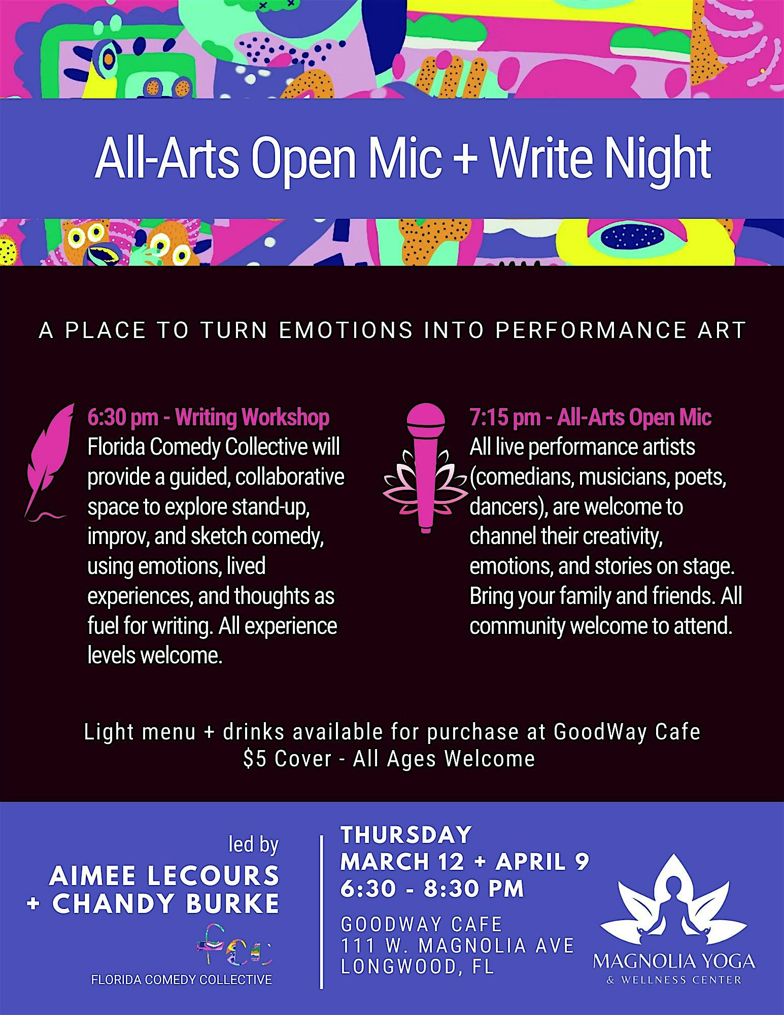by admin05Mar All-Arts Open Mic & Write Night with Florida Comedy Collective at Magnolia Yoga & Wellness Center – Longwood, FL All-Arts Open Mic & Write Night with Florida Comedy Collective at Magnolia Yoga & Wellness Center – Longwood, FL 2 2 people viewed this event. Come join Magnolia Yoga and Wellness Center and Florida Comedy Collective for an evening of harnessing emotions into performance art. Tickets-RSVP Link Date And Time Thursday, March 12th, 2026 06:00 PM (PST) Venue Magnolia Yoga & Wellness Center Location 111 West Magnolia Avenue, Longwood, FL 32750 Event Types Concert or PerformancePerforming & Visual Arts Event Category Florida Share With Friends Facebook Twitter Linkedin Xing Pinterest Share This Post: