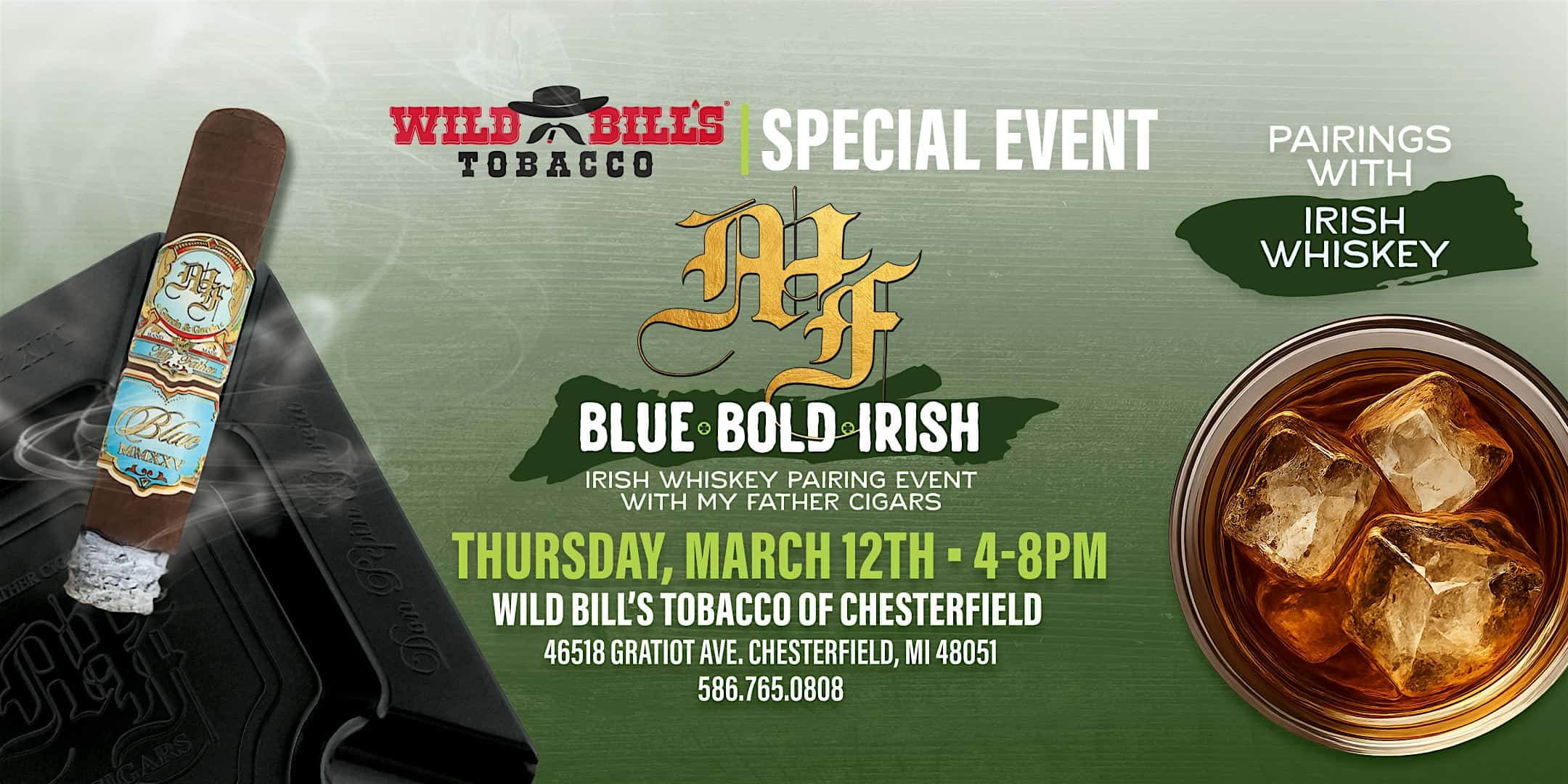 by admin23Feb Blue, Bold, and Irish with My Father Cigars at Wild Bill’s Tobacco – Chesterfield, MI Blue, Bold, and Irish with My Father Cigars at Wild Bill’s Tobacco – Chesterfield, MI 3 3 people viewed this event. Join Wild Bill’s as we enjoy a special event featuring My Father Cigars where we pair Irish Whiskey and celebrate the release of the Blue! Tickets-RSVP Link Date And Time Thursday, March 12th, 2026 @ 04:00 PM Location 46518 Gratiot Avenue, Chesterfield, MI 48051 Event Types Food & DrinkParty or Social Gathering Event Category Michigan Share With Friends Facebook Twitter Linkedin Xing Pinterest Share This Post: