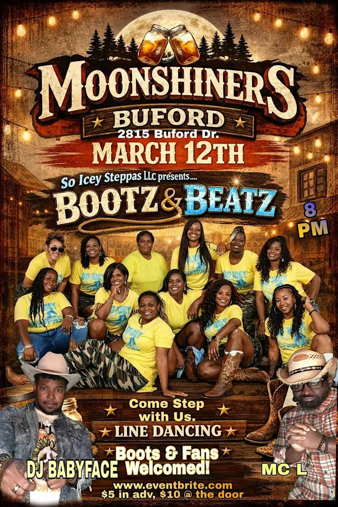 by admin05Mar Bootz and Beatz at Moonshiners at Moonshiners Buford – Buford, GA Bootz and Beatz at Moonshiners at Moonshiners Buford – Buford, GA 2 2 people viewed this event. Get ready to groove and move at Bootz and Beatz! Every 2nd Thursday at Moonshiners Buford. Tickets-RSVP Link Date And Time Thursday, March 12th, 2026 07:00 PM (PDT) Venue Moonshiners Buford Location 2815 Buford Drive, Buford, GA 30519 Event Types Food & DrinkParty or Social Gathering Event Category Georgia Share With Friends Facebook Twitter Linkedin Xing Pinterest Share This Post: