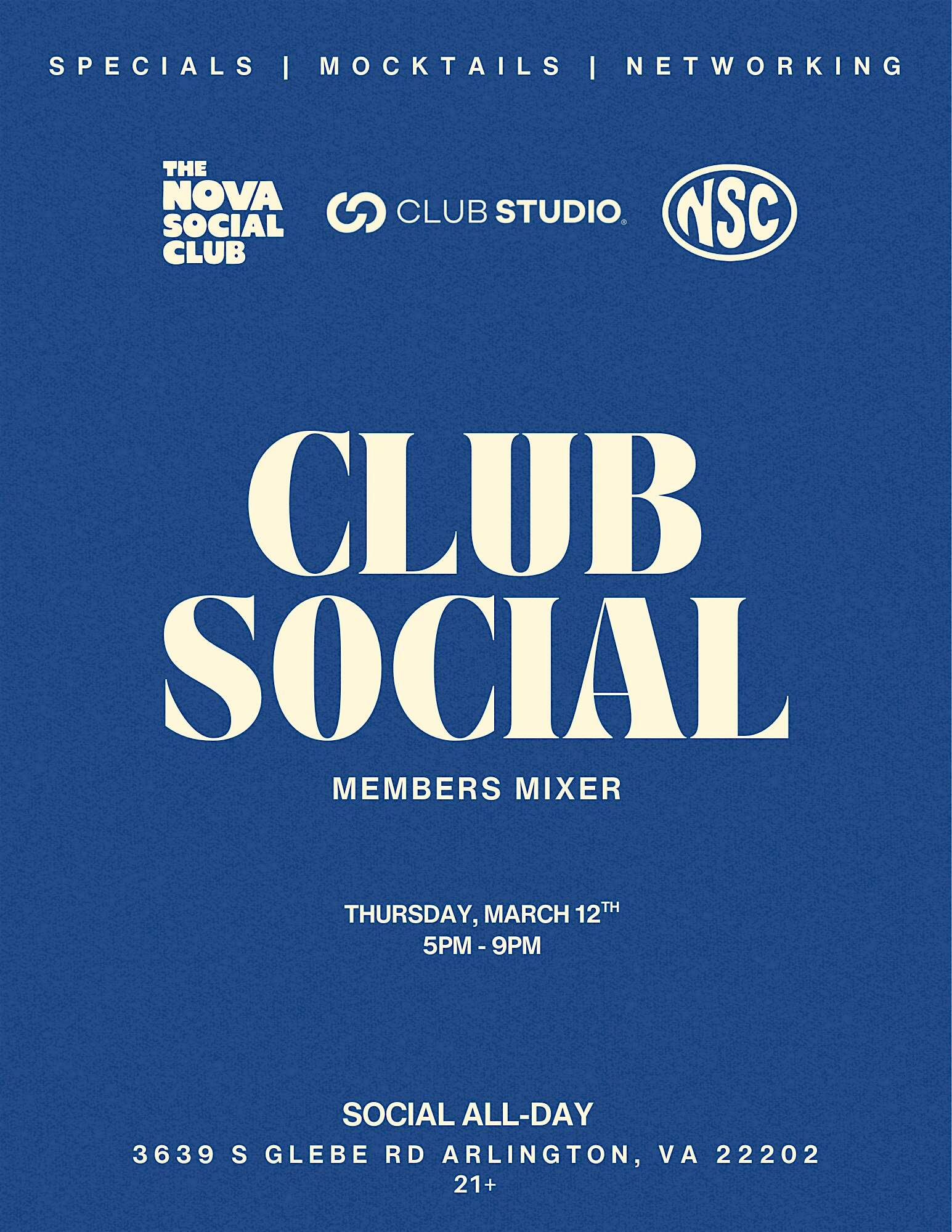 by admin23Feb Club Social Mixer x Club Studio | Thursday, March 12th at Social All Day at Social All Day – Arlington, VA Club Social Mixer x Club Studio | Thursday, March 12th at Social All Day at Social All Day – Arlington, VA 2 2 people viewed this event. Mix, Mingle, Network or Vibe with Club Studio & The NOVA Social Club Thursday, March 12th at Social All Day Bar! Tickets-RSVP Link Date And Time Thursday, March 12th, 2026 05:00 PM (PST) Venue Social All Day Location 3639 South Glebe Road, Arlington, VA 22202 Event Types Food & DrinkParty or Social Gathering Event Category Virginia Share With Friends Facebook Twitter Linkedin Xing Pinterest Share This Post:
