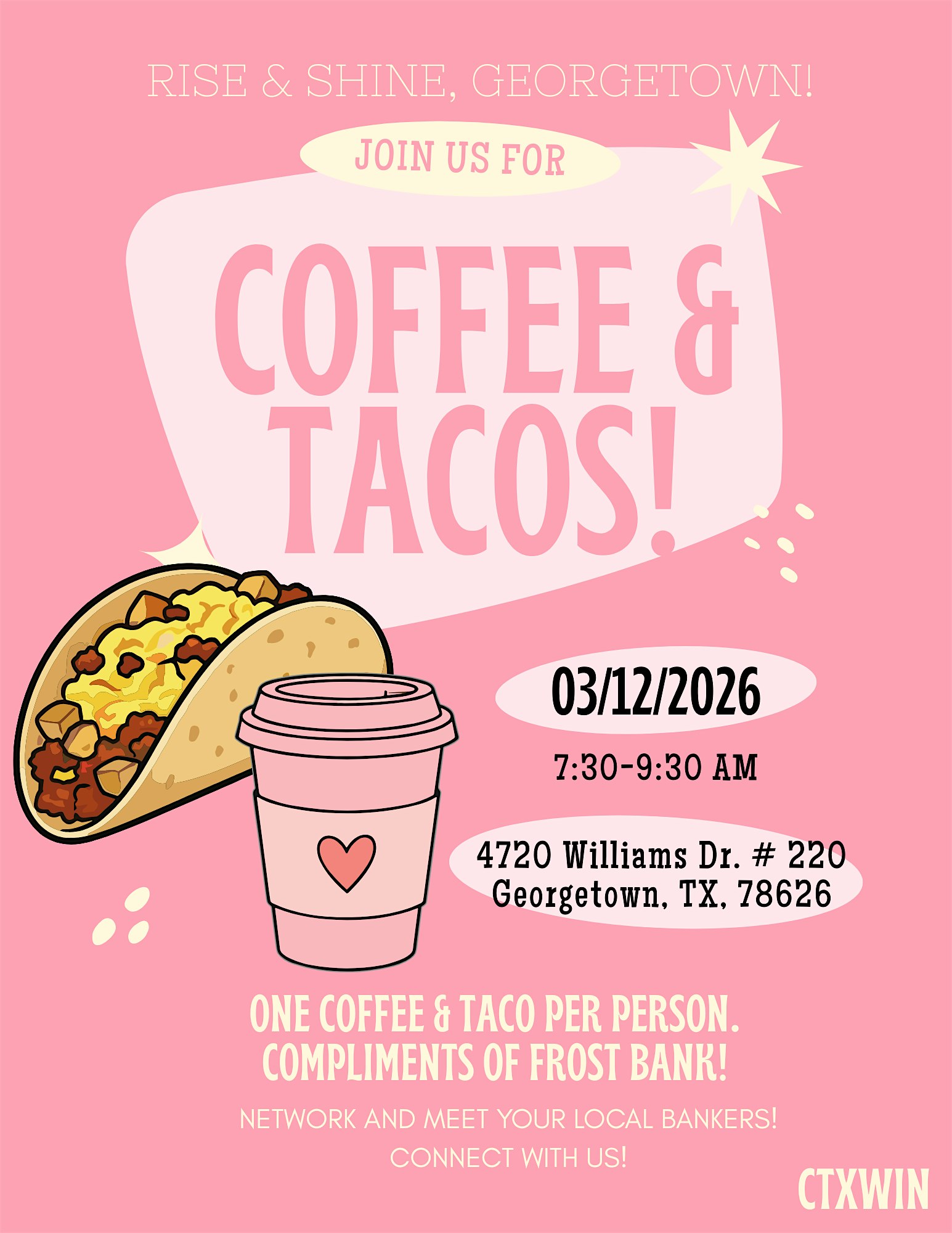 by admin05Mar Coffee, Tacos and networking! at Texas Honey Ham Company Georgetown – Georgetown, TX Coffee, Tacos and networking! at Texas Honey Ham Company Georgetown – Georgetown, TX 2 2 people viewed this event. Frost bank is hosting free breakfast taco and free cup of coffee at Texas Honey Ham! Come join us! Tickets-RSVP Link Date And Time Thursday, March 12th, 2026 07:00 AM (PST) Venue Texas Honey Ham Company Georgetown Location 4720 Williams Drive, Georgetown, TX 78633 Event Types Food & Drink Event Category Texas Share With Friends Facebook Twitter Linkedin Xing Pinterest Share This Post: