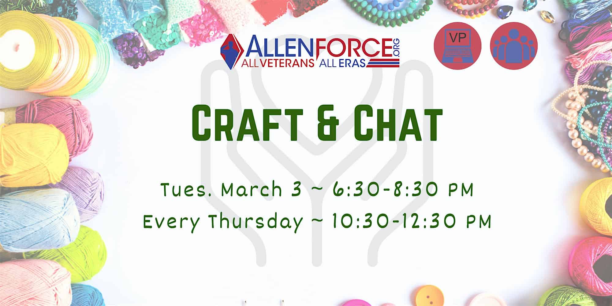 by admin14Feb Craft & Chat at 3581 Hennepin Dr – Joliet, IL Craft & Chat at 3581 Hennepin Dr – Joliet, IL 2 2 people viewed this event. Veterans & loved ones: Bring your favorite craft from home or try ours! Relax, create, and connect in person or on Zoom. Tickets-RSVP Link Date And Time Thursday, March 12th, 2026 03:00 PM (PST) Venue 3581 Hennepin Dr Location 3581 Hennepin Drive, Joliet, IL 60431 Event Types Party or Social Gathering Event Category Illinois Share With Friends Facebook Twitter Linkedin Xing Pinterest Share This Post: