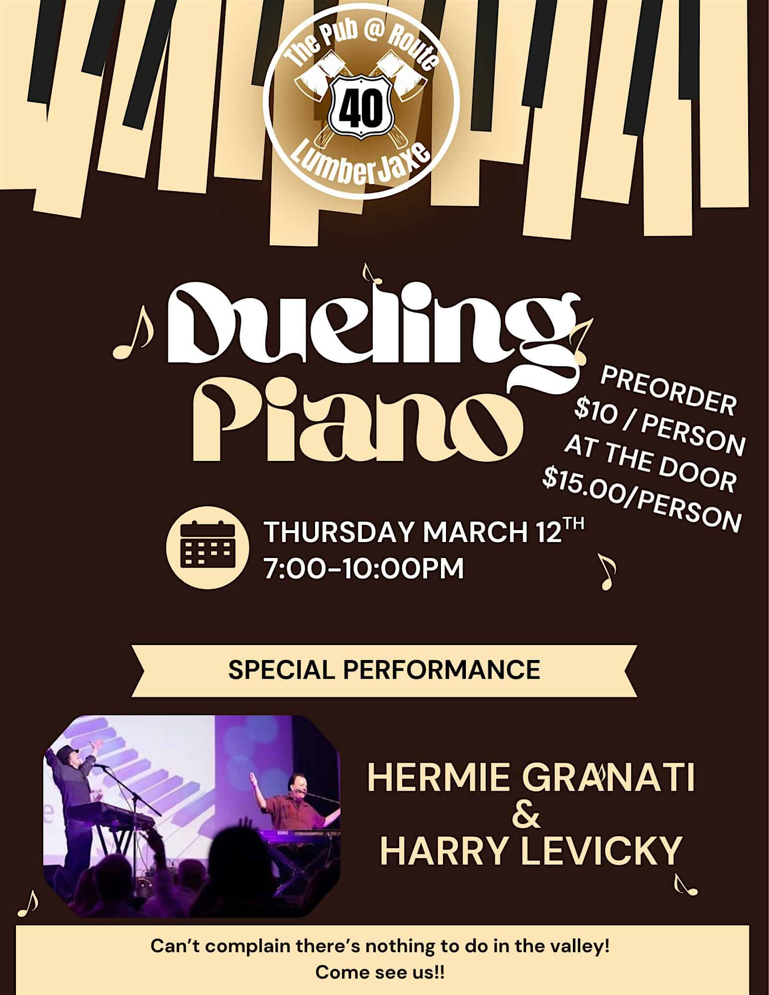 by admin14Feb Dueling Piano with Hermie & Harry at Route 40 Lumberjaxe – Belmont, OH Dueling Piano with Hermie & Harry at Route 40 Lumberjaxe – Belmont, OH 4 4 people viewed this event. DUELING PIANOS NIGHT at Route 40 LumberJaxe! Get ready for a high-energy night full of music, laughs, and sing-along fun! Tickets-RSVP Link Date And Time Thursday, March 12th, 2026 11:00 PM (PST) Venue Route 40 Lumberjaxe Location 41761 National Road, Belmont, OH 43719 Event Types Concert or PerformancePerforming & Visual Arts Event Category Ohio Share With Friends Facebook Twitter Linkedin Xing Pinterest Share This Post: