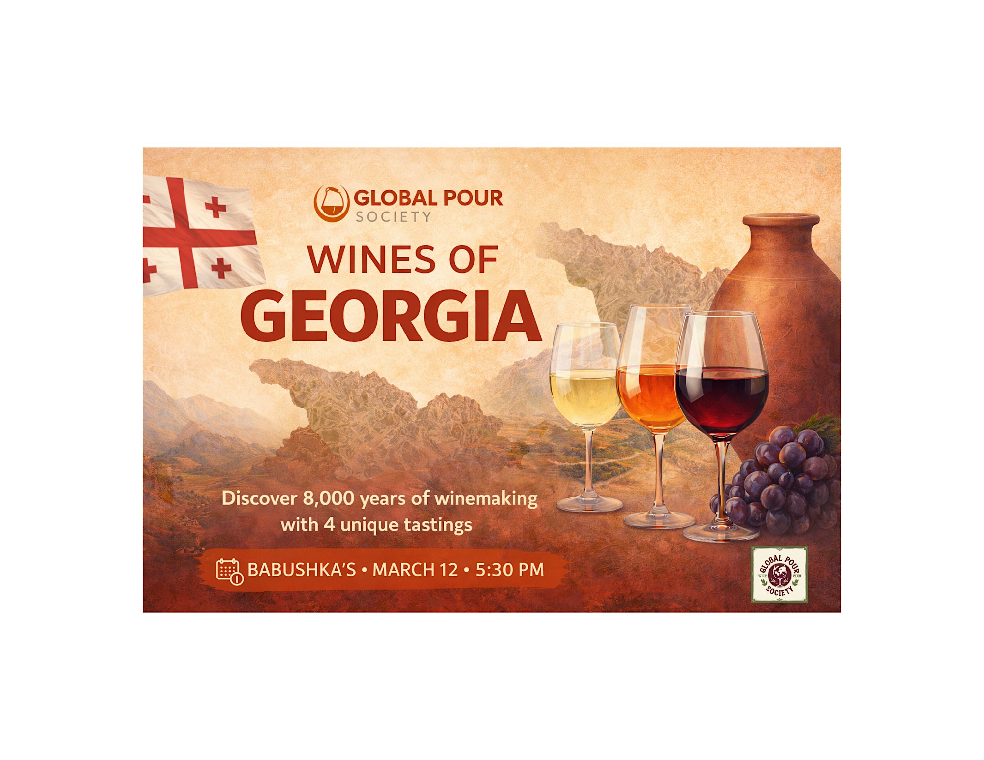 by admin27Feb Georgia Uncorked: A Journey to the World’s Oldest Wine Region at Babushka’s – Temple Terrace – Temple Terrace, FL Georgia Uncorked: A Journey to the World’s Oldest Wine Region at Babushka’s – Temple Terrace – Temple Terrace, FL 1 1 people viewed this event. Ancient clay wines, bold reds, and vibrant whites—experience Georgia, the world’s oldest wine region. March 12, 5:30 PM. Tickets-RSVP Link Date And Time Thursday, March 12th, 2026 05:00 PM (PST) Venue Babushka's - Temple Terrace Location 12639 North 56th Street, Temple Terrace, FL 33617 Event Types Food & Drink Event Category Florida Share With Friends Facebook Twitter Linkedin Xing Pinterest Share This Post: