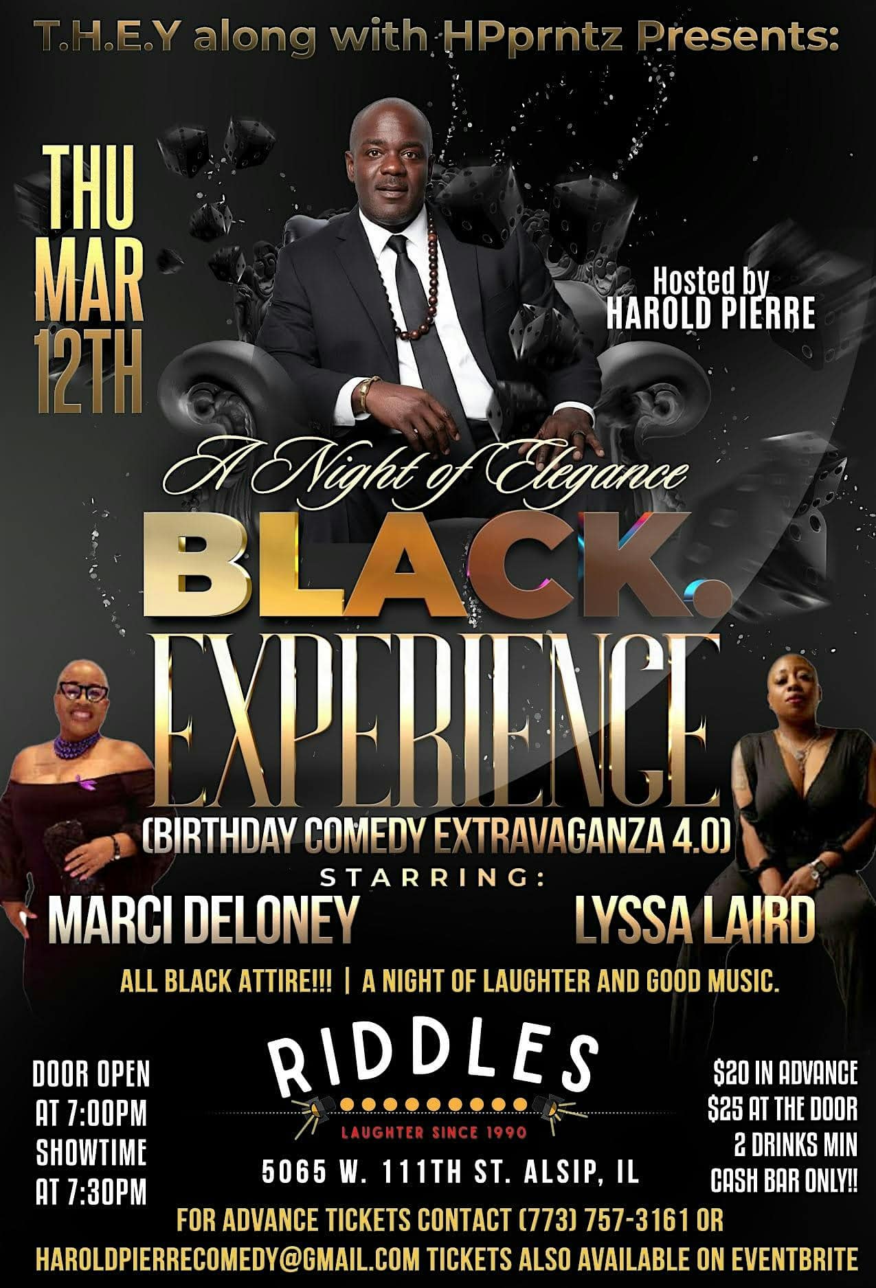 by admin23Feb Harold Pierre’s Birthday Comedy Extravaganza 4.0 (BLACK Experince) at Riddles Comedy Club – Alsip, IL Harold Pierre’s Birthday Comedy Extravaganza 4.0 (BLACK Experince) at Riddles Comedy Club – Alsip, IL 1 1 people viewed this event. This event will be nothing short of amazing. Endless Laughter, Live Music and a host of great surprises. Hosted by: Harold Pierre Tickets-RSVP Link Date And Time Thursday, March 12th, 2026 @ 07:00 PM Location 5055 West 111th Street, Alsip, IL 60803 Event Types Party or Social GatheringPerforming & Visual Arts Event Category Illinois Share With Friends Facebook Twitter Linkedin Xing Pinterest Share This Post: