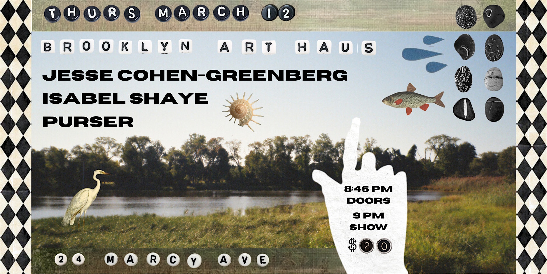 by admin05Mar Jesse Cohen-Greenberg, Purser, and Isabel Shaye at Brooklyn Art Haus – Brooklyn, NY Jesse Cohen-Greenberg, Purser, and Isabel Shaye at Brooklyn Art Haus – Brooklyn, NY 1 1 people viewed this event. Jesse Cohen-Greenberg writes tragicomic, ambivalent songs that are both heartbreaking and delightful. Tickets-RSVP Link Date And Time Thursday, March 12th, 2026 09:00 PM (PST) Venue Brooklyn Art Haus Location 24 Marcy Avenue, Brooklyn, NY 11211 Event Types Concert or PerformanceMusic Event Category New York Share With Friends Facebook Twitter Linkedin Xing Pinterest Share This Post: