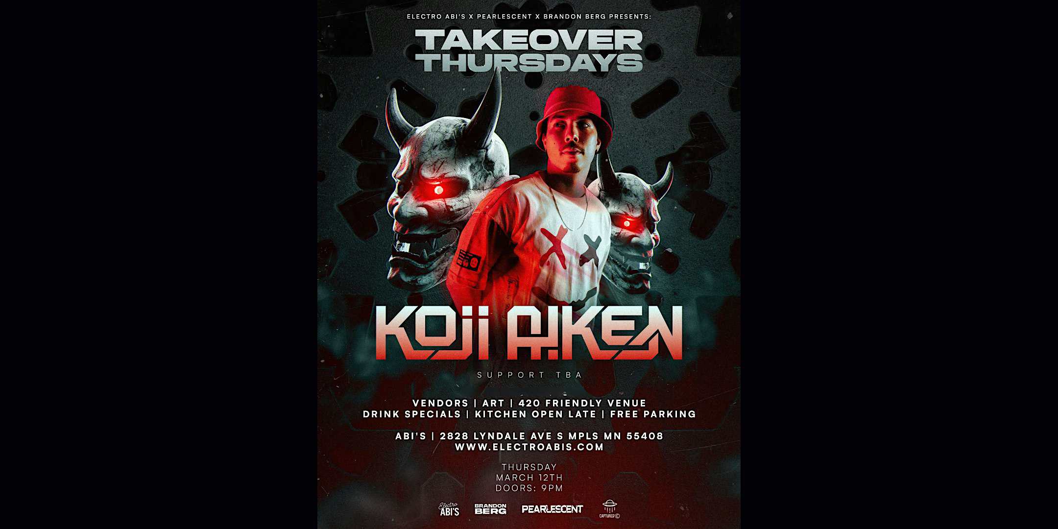 by admin23Feb KOJI AIKEN @ ELECTRO ABI’S MPLS at Abi’s Restaurant – Minneapolis, MN KOJI AIKEN @ ELECTRO ABI’S MPLS at Abi’s Restaurant – Minneapolis, MN 1 1 people viewed this event. ELECTRO ABI’S IS BACK WITH ANOTHER HUGE TAKEOVER THURSDAY HEADLINE SHOW AT ABI’S – FEATURING KOJI AIKEN’S MN DEBUT Tickets-RSVP Link Date And Time Thursday, March 12th, 2026 09:00 PM (PST) Venue Abi's Restaurant Location 2828 Lyndale Avenue South, Minneapolis, MN 55408 Event Types Concert or PerformanceMusic Event Category MinneapolisMinnesota Share With Friends Facebook Twitter Linkedin Xing Pinterest Share This Post: