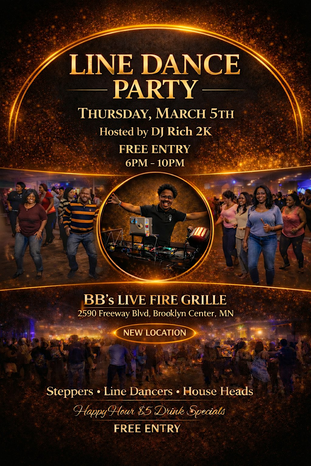 by admin05Mar LINE DANCE PARTY at BB’s LIVE FIRE GRILLE – Brooklyn Center, MN LINE DANCE PARTY at BB’s LIVE FIRE GRILLE – Brooklyn Center, MN 2 2 people viewed this event. Join us for a FREE Line Dance Party featuring Old School R&B, Classic Line Dances, Smooth Steppers, and Chicago House Music. Tickets-RSVP Link Date And Time Thursday, March 12th, 2026 06:00 PM (PST) Venue BB’s LIVE FIRE GRILLE Location 2590 Freeway Boulevard, Brooklyn Center, MN 55430 Event Types Party or Social GatheringPerforming & Visual Arts Event Category Minnesota Share With Friends Facebook Twitter Linkedin Xing Pinterest Share This Post: