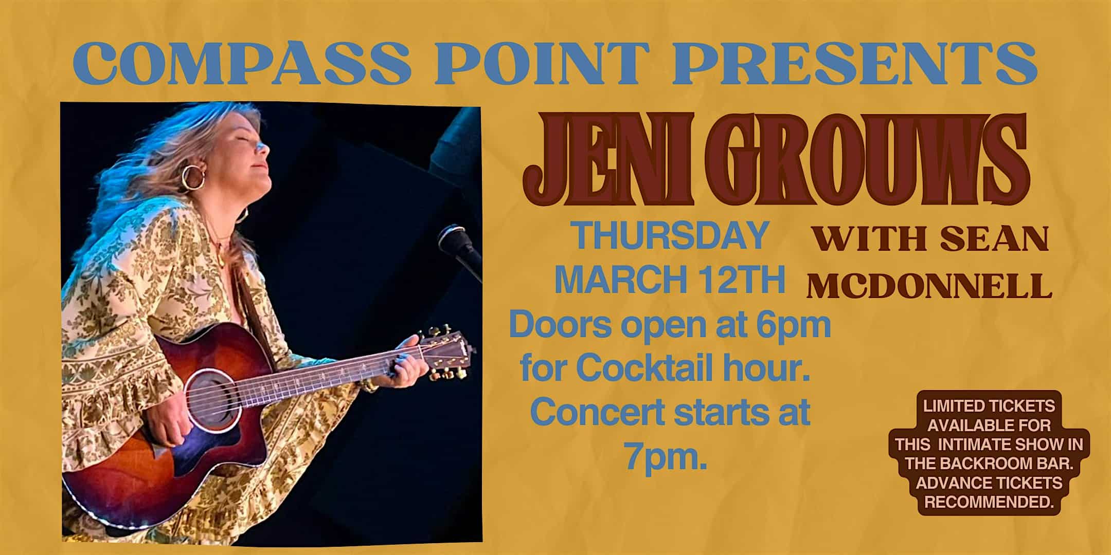 by admin23Feb Live Music – Jeni Grouws and Sean McDonnell at Compass Point home of Dirty Girl Adventures – Topeka, KS Live Music – Jeni Grouws and Sean McDonnell at Compass Point home of Dirty Girl Adventures – Topeka, KS 3 3 people viewed this event. Join Compass Point home of Dirty Girl Adventures in The Backroom Bar for a SPECIAL SHOW with our friends Jeni Grouws and Sean McDonnell! Tickets-RSVP Link Date And Time Thursday, March 12th, 2026 06:00 PM (PST) Venue Compass Point home of Dirty Girl Adventures Location 800 North Kansas Avenue, Topeka, KS 66608 Event Types Concert or PerformanceMusic Event Category Kansas Share With Friends Facebook Twitter Linkedin Xing Pinterest Share This Post: