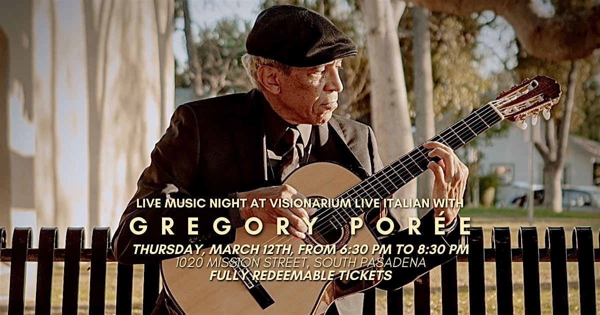 by admin27Feb Live Music Night at Visionarium Live Italian with Gregory Porée at 1020 Mission St – South Pasadena, CA Live Music Night at Visionarium Live Italian with Gregory Porée at 1020 Mission St – South Pasadena, CA 1 1 people viewed this event. Gregory Porée returns to Visionarium for a live music night featuring a mix of classical guitar repertoire, iconic covers, and originals! Tickets-RSVP Link Date And Time Thursday, March 12th, 2026 06:00 PM (PST) Venue 1020 Mission St Location 1020 Mission Street, South Pasadena, CA 91030 Event Types Concert or PerformanceMusic Event Category CaliforniaLos Angeles Share With Friends Facebook Twitter Linkedin Xing Pinterest Share This Post: