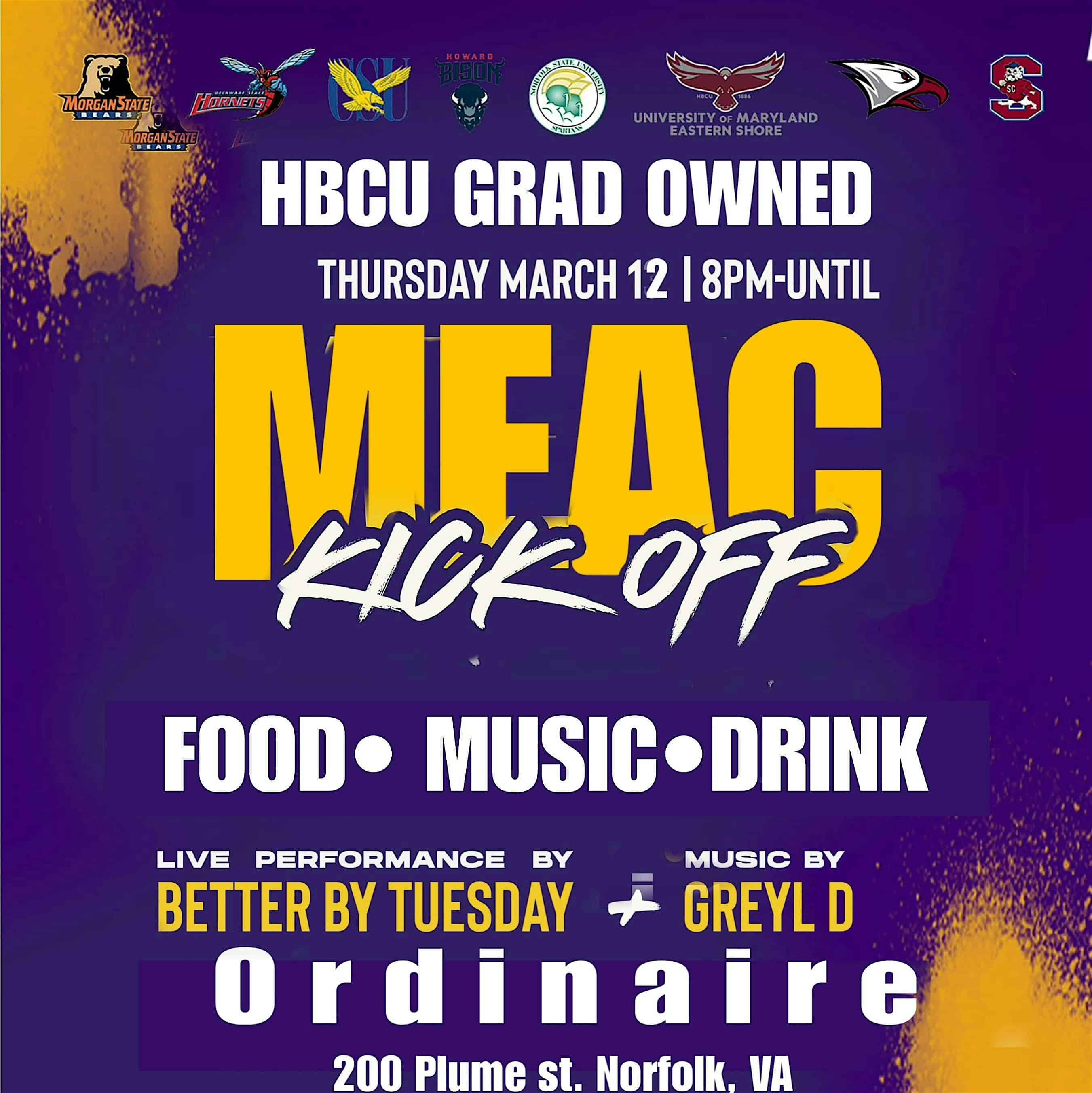 by admin23Feb MEAC KICK OFF Thursday March 12, 2026 at Ordinaire – Norfolk, VA MEAC KICK OFF Thursday March 12, 2026 at Ordinaire – Norfolk, VA 1 1 people viewed this event. Kick off MEAC with a bang – join us for an evening of stellar entertainment, food & drink specials & mingling with a mature MEAC crowd. Tickets-RSVP Link Date And Time Thursday, March 12th, 2026 @ 08:00 PM Location 200 East Plume Street, Norfolk, VA 23510 Event Types Party or Social GatheringSports & Fitness Event Category NorfolkVirginia Share With Friends Facebook Twitter Linkedin Xing Pinterest Share This Post:
